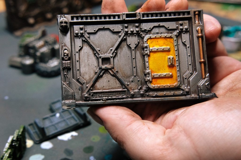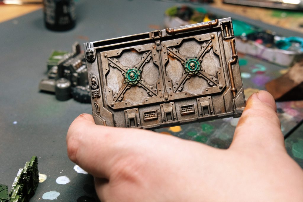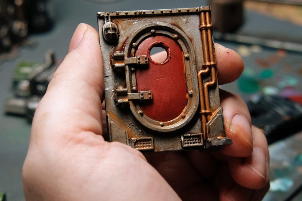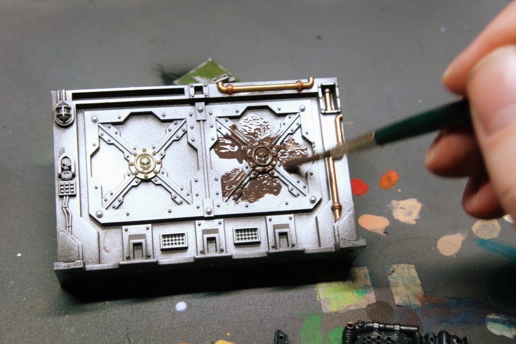 Starting out with some ProAcryl Mahogany and Newsh I blobbed it all over this shiny metal bulkhead, before carefully wiping away the excess with a makeup sponge.