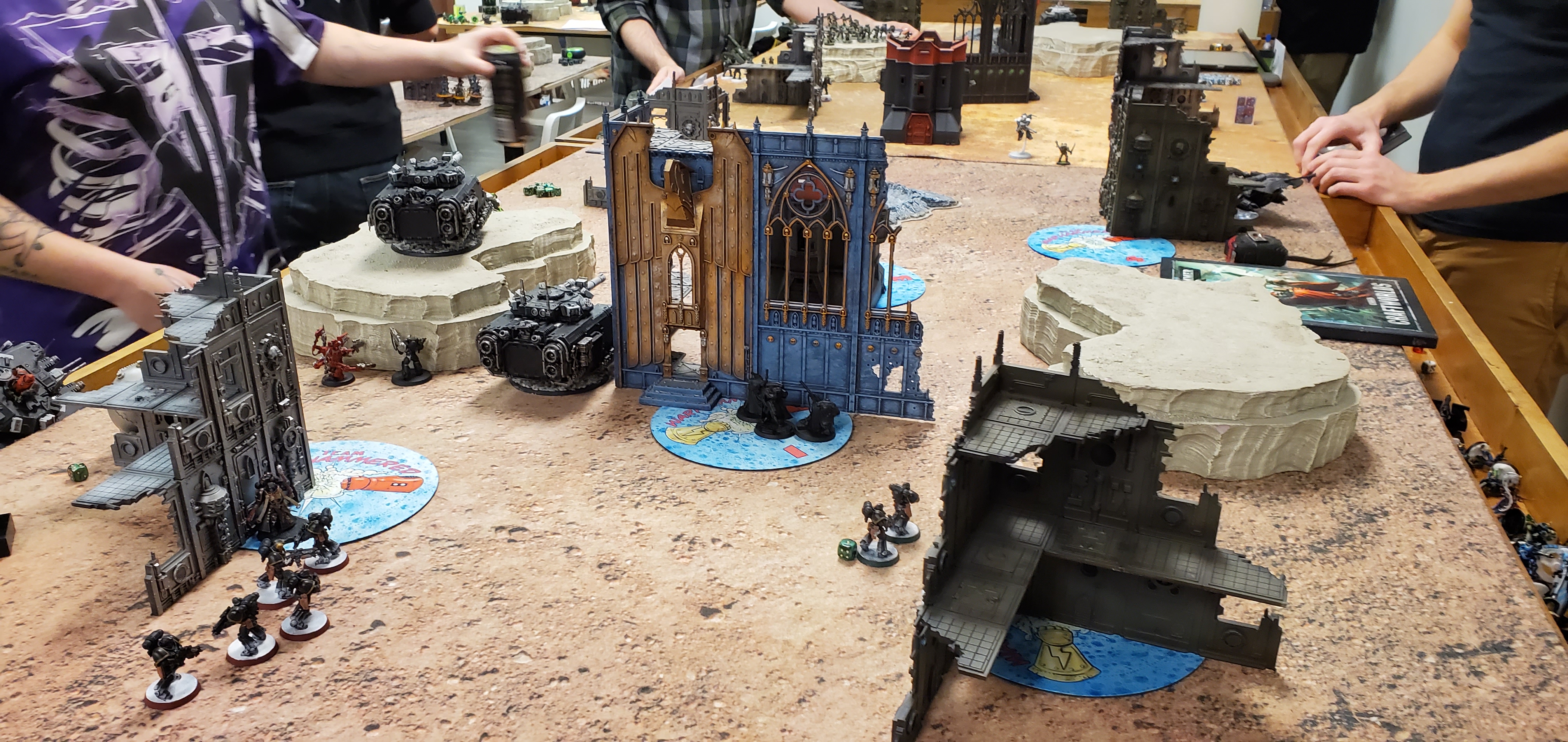 Game two was against Jacob Hopfensperger commanding a very nicely painted Imperial Guard Cadian brigade featuring a large number of plasma Scions, a fist of Russes, Manticores, Bullgryns, and a slough of Guardsmen, Lascannon Sentinels, and support characters. As it was Mission 2 he deployed first and went first - the Russes deployed centrally with Manticores and Sentinels on the wings and a slough of infantry spread across the front line and Scions in deepstrike. There was a lot of LoS blocking terrain to take advantage of in this game and I deployed defensively into the corners minimizing sight lines and then awaited to go second.