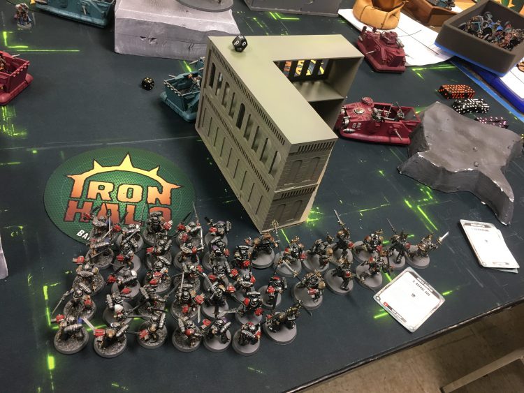 A real barn burner. I did make a mistake and got shot off my center bottom objective on a turn when I realized I could have disembarked my engineering Rangers to double cover. That would have given me one more point as we pushed Hold More on one turn. However he also made a mistake heroic-ing into the priests letting me wrap him, staying safe for a turn, and protecting my characters that were in the line of fire for his Exectioner. He consistently got Kill More, obviously, but my hold more and bonus grabbing got me through.