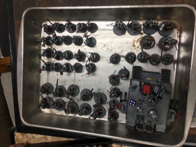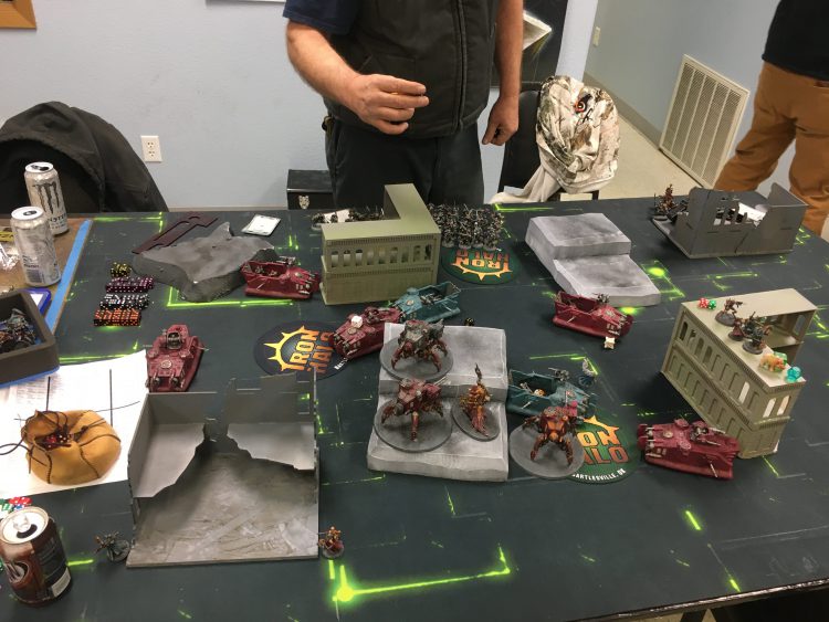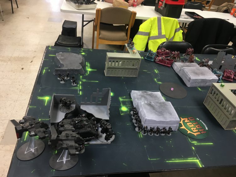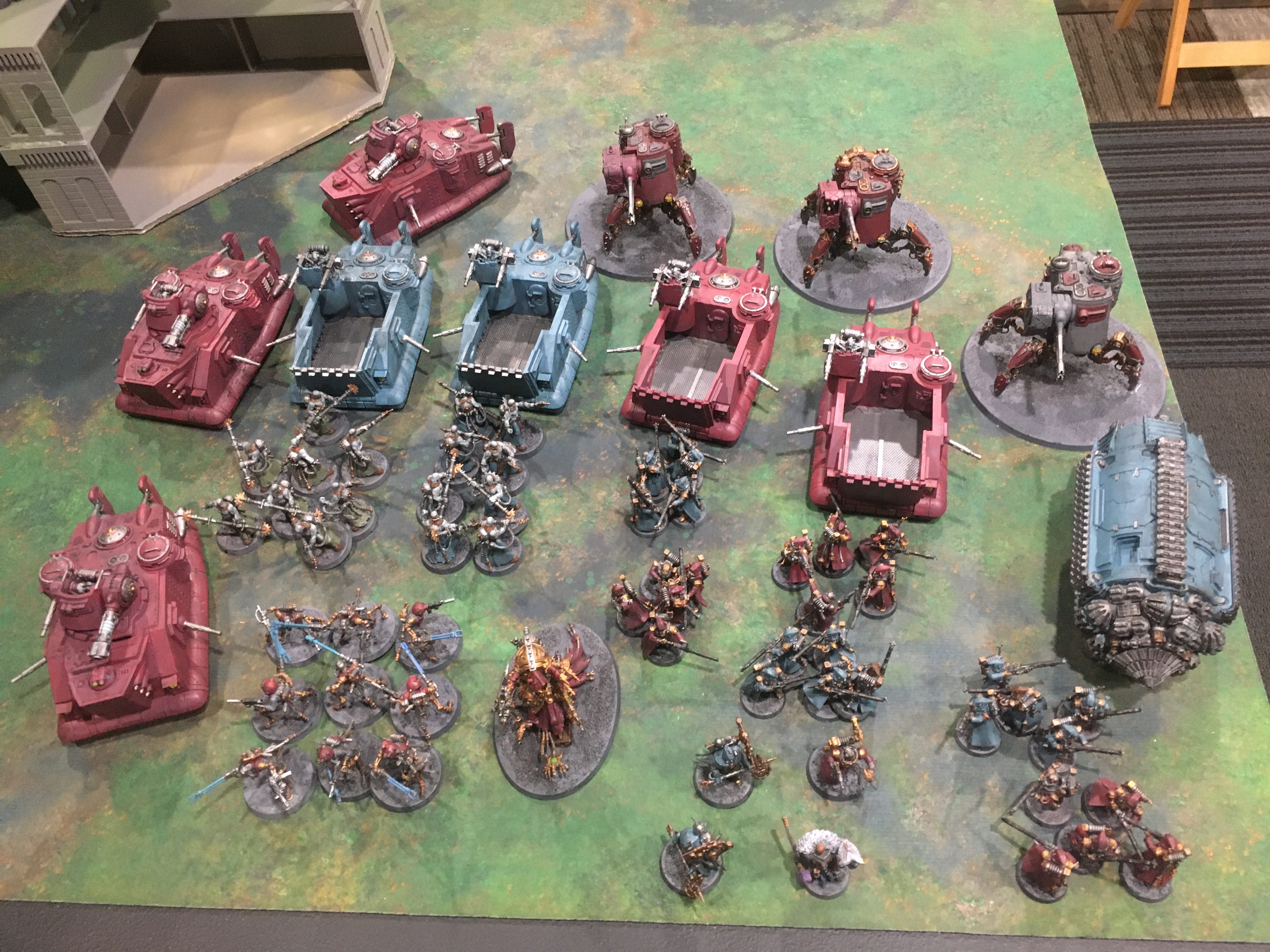 If this looks familiar it is. 5 transports and 6 tanks has been the core of my army since way back at Slaughterhouse. I've had some ups and downs over the year with the list but I feel the GSC/Ork hordes are currently oppressed and I think I have play with Marines with the changes. Having an ignore overwatch spell/melee threat/double tap mortal wounds caster is real nice and makes Coteaz an easy replacement for the now 95 point Assassin Sideboard. And with all the points drop, cutting a couple priests, and downgrading the good-but-somewhat dubious-value-because-of-range-bands-Daedalosus opens up enough room for 9 Infiltrators giving me a Wrath of Mars delivery mechanism which may have bailed me out of the Iron Hands AND Chaos Knight matches I had at Renegade. Anyway it's cold out, let's get to the games.