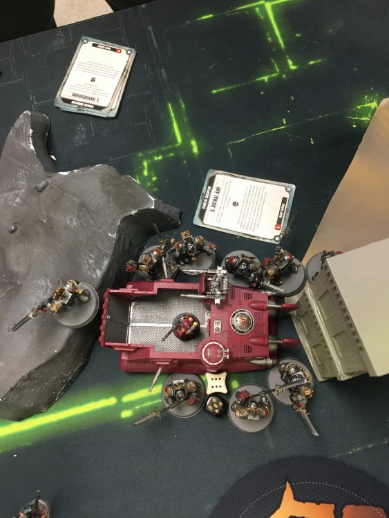 On my turn three, the priests in my right ride get out and set up a charge into the Redemptor, my Infiltrators come down where his Infiltrators were to Wrath of Mars his Cents and my drill pushes forward with the remainder of my top priests into his Intercessors. Most of his Cents die, most of his troops die, and his Redemptor got his overwatch turned off so it could take some chip damage but doesn't go down to combined shooting/double fighting priests, but they do get it wrapped. Bonus Point. His counter finishes off a Disintegrator and the antenna of his Executioner can see over the ruin and picks up my Infiltrators. He charges my priests with his chapter master and Feirros. I lose all but one priest in the combats.