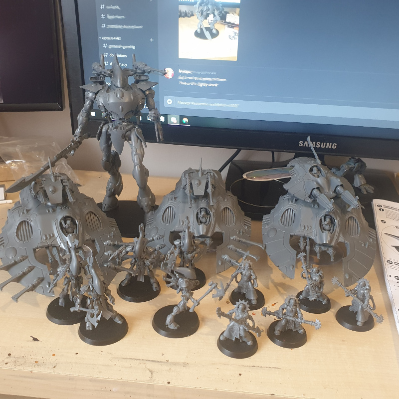 I'm just about done painting 3 Crimson Hunter Exarchs, which have been a big help in my list for dealing with stuff where the rest of my shooting wasn't getting the job done. I also have built and primed the three Ravagers I need to have ready for the London Open this weekend. So with all that good progress, but plenty still to do - I've been flirting with taking mostly Craftworlds to NoVA instead! This inspired a bit of building, but uh, none of the Wraithblades, the Wraithknight, or one of the Wave Serpents you can see above is in my potential list. Nor are the Electro-Priests, obviously. This kind of focus is just what you need in crunch time.