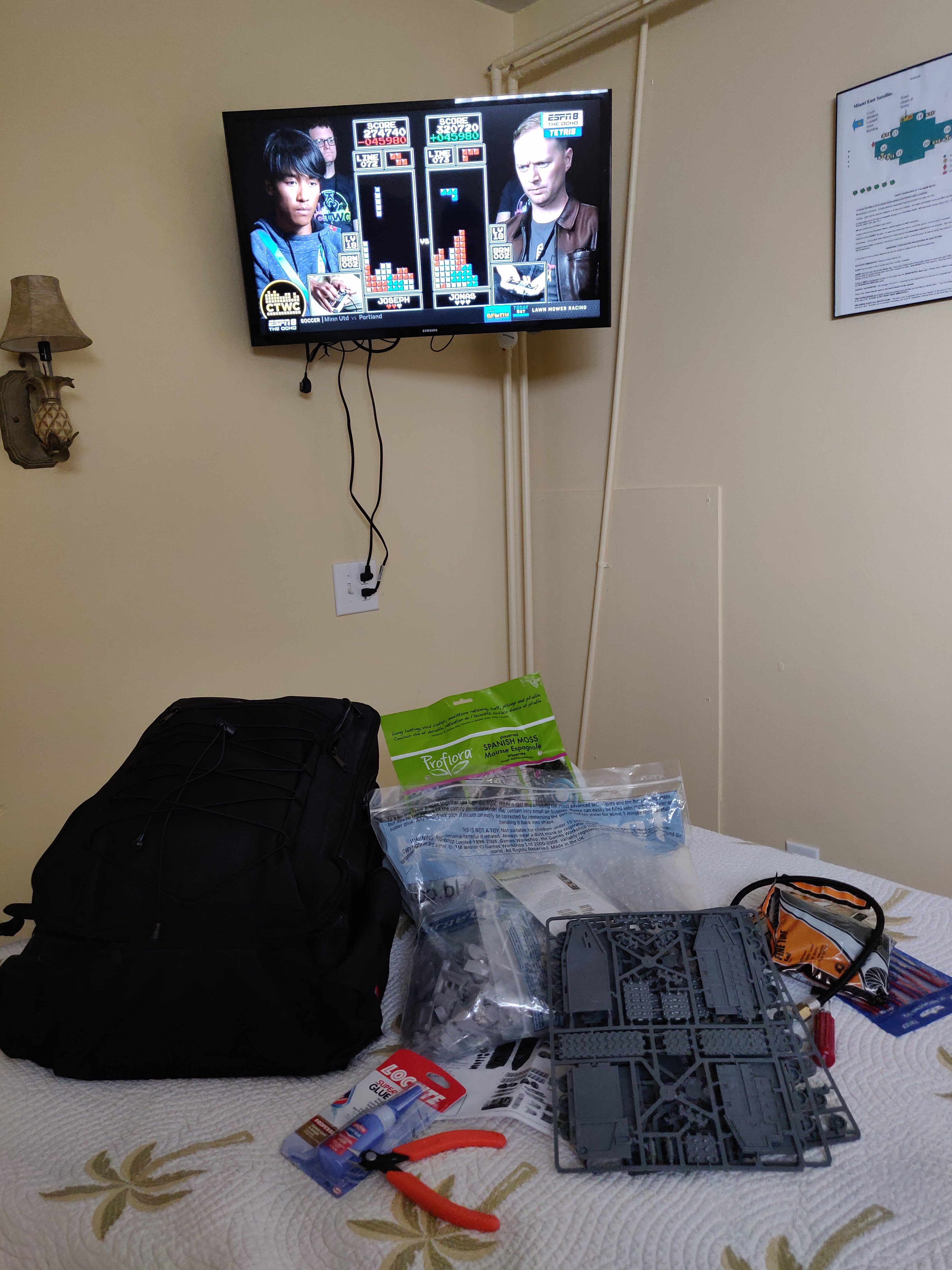 Ok, deep breaths buddy. +++Tearily blurts in machine code+++ With about three weeks to go before Nova, I'm sitting in a hotel room with basically everything hobby related I own, watching the 2018 Tetris World Championship on ESPN 8 ("The Ocho"), and getting ready to start assembly on a Falchion. Most of the army could be considered battle ready, but I still have a ton of stuff to do to get to where I want to be by Nova, and even farther to where I'll truly be ready to call it done. The vacation days I was hoping to use to get a ton done ended up being spent doing farm work at my parents and then recovering from said work, which makes me a good son but a bad Ham. It feels like I can probably get everything done if I bust my ass, but I'm notoriously bad at judging that and there's a new codex about to drop to tempt me into bad decisions so we'll just have to see.