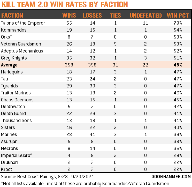 79% win rate so far. They've also won all but one of the events in our sample, and have gone undefeated 11 times in events, for a record of 55 wins, 14 losses, and 1 tie. They are without peer in Kill Team 2.0, and it's not particularly close. Grey Knights have also put up some respectable numbers, and Kommandos and Veteran Guardsmen also appear to have done alright. Mechanicus have too, which is good news for players who want to switch to the new