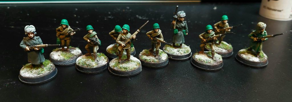 My platoon scale game of choice for this period is Chain of Command, so I constructed the force itself with that in mind. A late-war Soviet Infantry Platoon in that system has a baseline of three squads, each consisting of 7 riflemen, two LMG crew, and an NCO; as well as a commander.