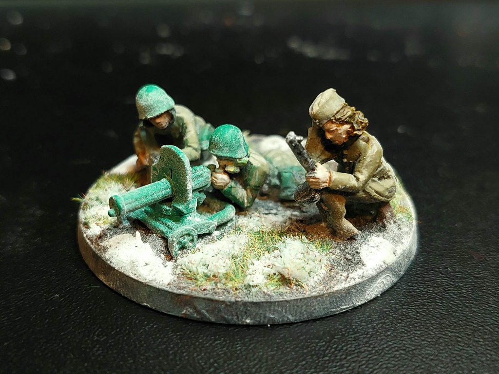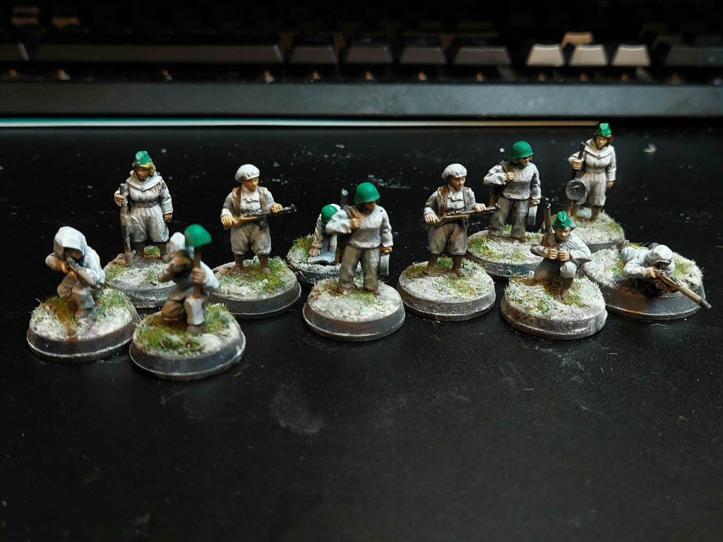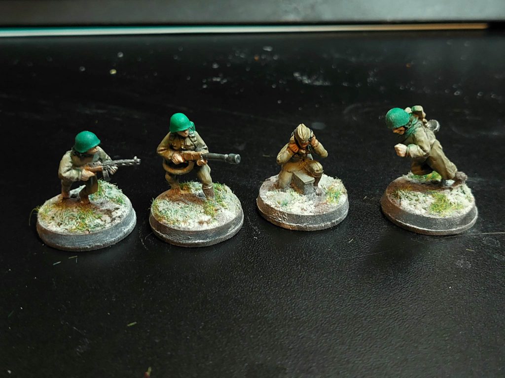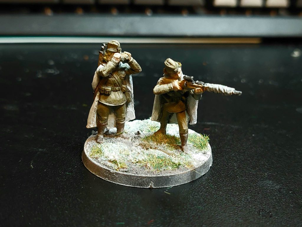 For painting, I first zenithal primed everything with an airbrush, then gave all the uniforms an airbrush coat of Vallejo Khaki, and the helmets a deep green. The fun thing about Soviet uniforms is that you can get away with basically any shade on the spectrum of green to brown. Uniforms were made somewhat hurriedly, and there wasn’t any real system of standardisation. Besides after field use uniforms tend to change colour from wear, so yeah, any shade you like, as long as it’s earthy. Greatcoats in particular varied enormously in colour, so they’ve been painted a mix of khaki, green and dark grey-green. The scout squad, I figure, were better equipped for the winter due to their more precarious position, so they’re equipped with the white smocks and trousers issued to snipers and scout units for winter camouflage. The snipers have khaki uniforms, but with winter capes for the purposes of camouflage.