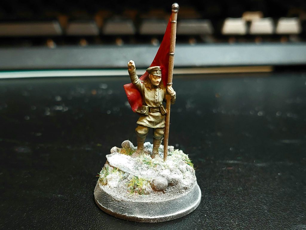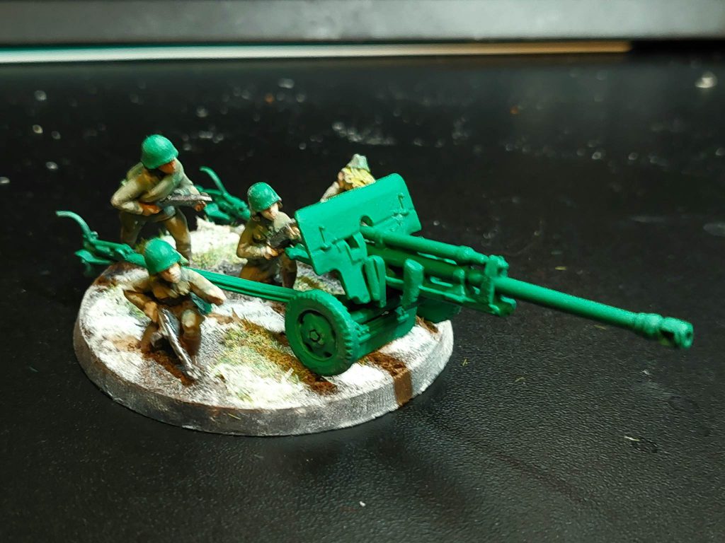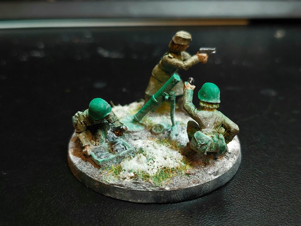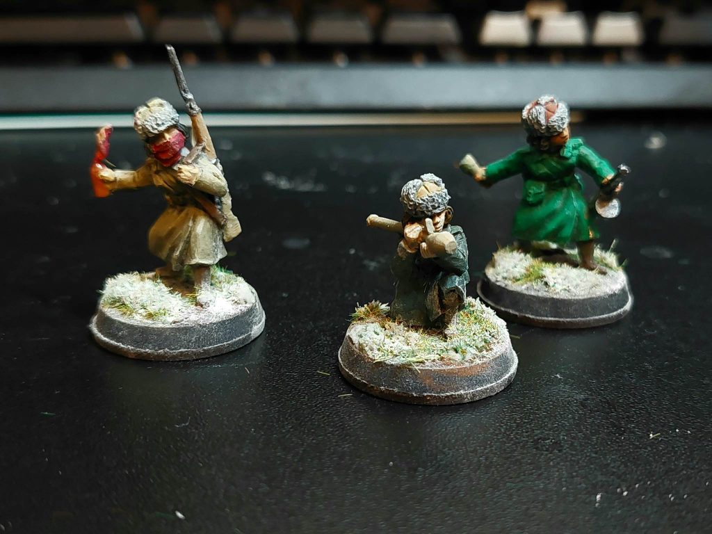 For painting, I first zenithal primed everything with an airbrush, then gave all the uniforms an airbrush coat of Vallejo Khaki, and the helmets a deep green. The fun thing about Soviet uniforms is that you can get away with basically any shade on the spectrum of green to brown. Uniforms were made somewhat hurriedly, and there wasn’t any real system of standardisation. Besides after field use uniforms tend to change colour from wear, so yeah, any shade you like, as long as it’s earthy. Greatcoats in particular varied enormously in colour, so they’ve been painted a mix of khaki, green and dark grey-green. The scout squad, I figure, were better equipped for the winter due to their more precarious position, so they’re equipped with the white smocks and trousers issued to snipers and scout units for winter camouflage. The snipers have khaki uniforms, but with winter capes for the purposes of camouflage.