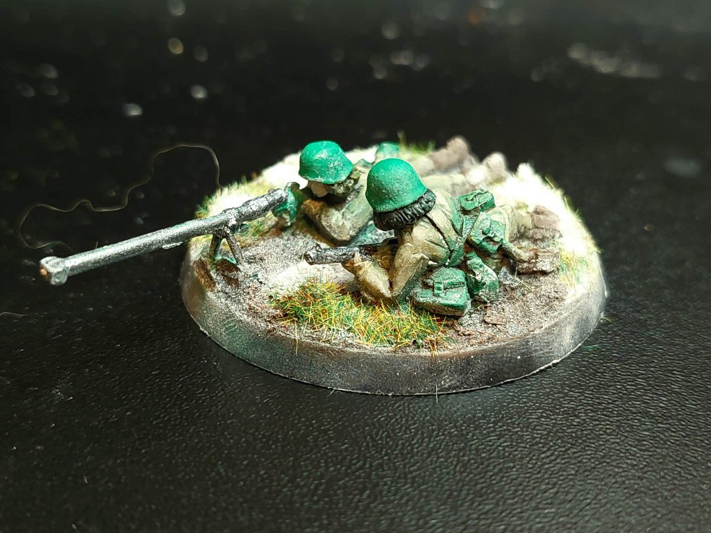 I encountered something of an issue with the anti-tank gun - Bad Squiddo do not yet make a gun crew, just mortar and HMG crews. I took a couple of riflewomen, snipped off the ends of their rifles, then filed the remaining bits smooth so they appeared to be large shells. The remaining two crew are an artillery spotter, with radio, and a tank rider, conveniently pointing towards the enemy. I also made a square base to represent tank riders, but this is mostly if I use this platoon for Bolt Action, or some other game that allows for tank riders (Chain of Command does not, as tanks were ridden between battlefields, not on them).