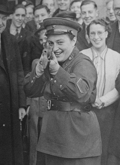 Pavlichenko aiming a Home Guard rifle in London, 1942