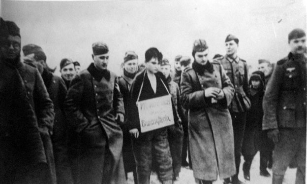 Zoya Kosmodemyanskaya being led to the gallows. The sign around her neck condemns partisans.