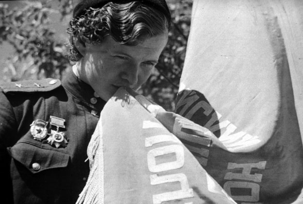 Night Witches Commander Yevdokiya Bershanskaya receives the Guards banner