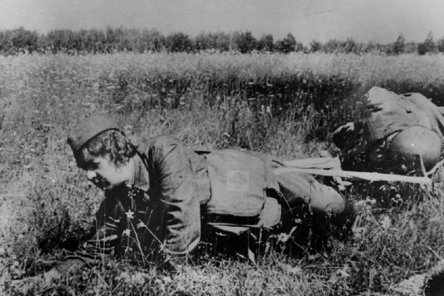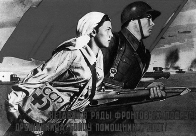 Media was inundated with depictions of socialist martyrdom, and films extolling the heroism of those who fought in the civil war were a frequent filmic motif. In the extremely popular 1934 film Chapaev, one of the main characters was Anka, a young woman machine gunner. In a triumphant moment, while the male soldiers are paralysed by panic, Anka grabs the Maxim gun and mows down White cavalry, turning the tide. Anka was the picture of the soviet “new woman” - serious, resolute, courageous, taking her place alongside her male compatriots in the new Soviet world. In 1935 the film Podrugy [Girlfriends] depicted three Red Army nurses during the civil war, on frontline duty. As in Chapaev they demonstrate courage under fire and demonstrate traditionally masculine military virtues, while still affirming the ‘feminine’ qualities that were popular under Stalin’s reign - attractiveness, loving, and desiring motherhood. In other media similar values were being extolled. The novel How the Steel was Tempered by Nikolai Ostrovsky became a massive success following its publication in Young Guard. Although the story depicted a male veteran of the civil war, the book became a major inspiration for the future frontovichki (the women frontline fighters). The political discourse of the time encouraged Soviet citizens towards a more gender neutral perception of heroism, and in doing so inadvertently imbued women with more of a militaristic spirit than what was perhaps intended (more on that below).