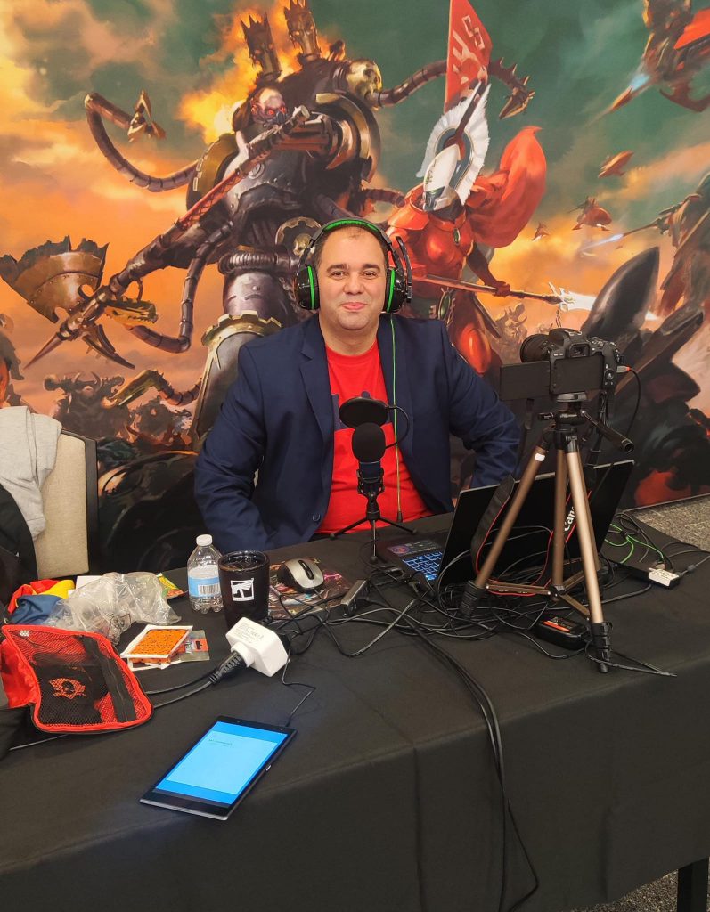 First of all the main event area was a very large room surrounded by flags from every participating company, with wall-to-wall tables and the streaming set-ups for Age of Sigmar and Warhammer 40k. It was just an awesome vibe by the room itself. We started to lend a hand as soon as we could to Jon Sao and his own stream.