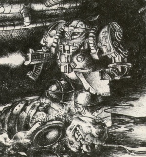 Chaos Squats getting dealt with by their non-mutant brethren. Rogue Trader era art.