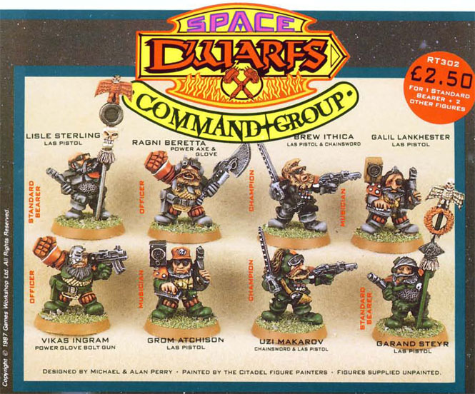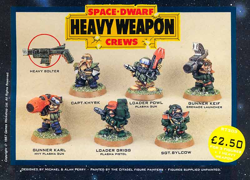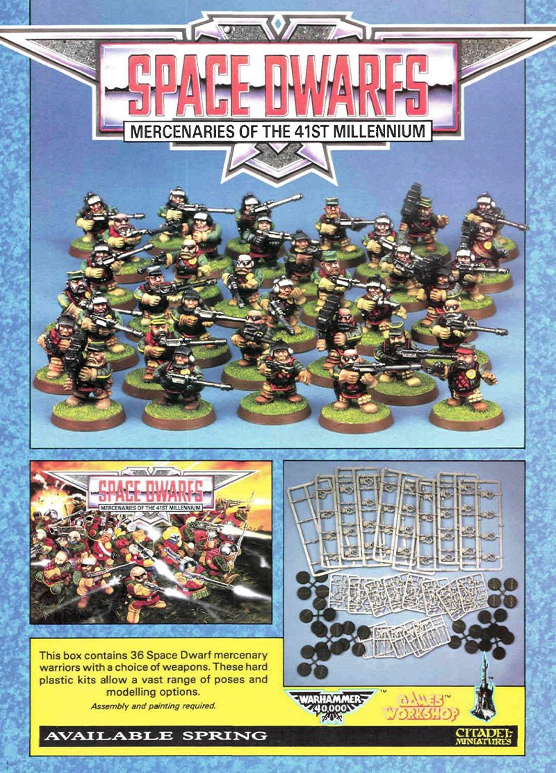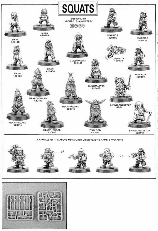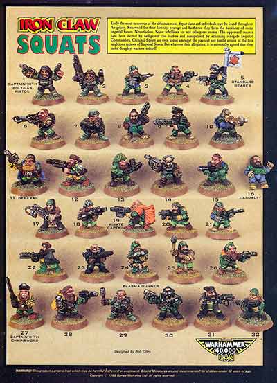 Very early Rogue Trader had several marketing flyers, and ranges appeared in these, as well as in the Book of the Astronomican (the first 40k supplement) and White Dwarfs. Most of the pictures in this article are taken from these sources. There were several distinct releases that formed the early Squat range, including no less than three large infantry ranges.