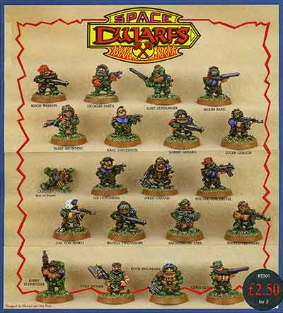 For 40k oldtimers, you may remember the Thankyou Mr President Flyer having the metal Space Marine, Space Ork, Space Elves and Space Squat ranges and it is worth noting that the Squats were the biggest range of figures in the initial Rogue Trader pre-launch offering, with 20 sculpts to Space Marines 13, Space Orks 17 and Space Elves 12. Squats were a big range from the start.