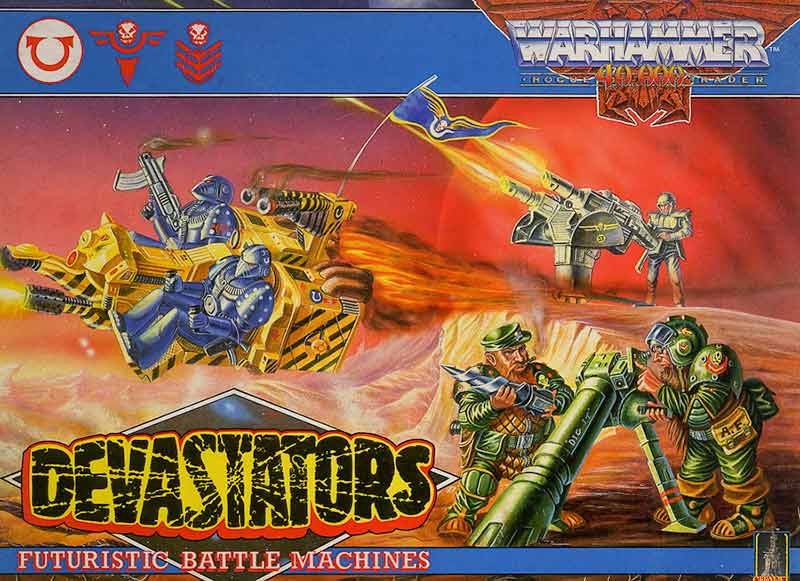Devastators was a boxed set featuring the Space Marine Landspeeder, Imperial Guard Tarantula, and a Squat Mole Mortar. This was a boxed set that had a Space Marine unit, an Imperial Guard unit and a Squat unit, and they all unsurprisingly ended up available separately later, where you could order two gunners and whatever weapon you wanted, and the Landspeeder gained alternative Imperial Guard crew.