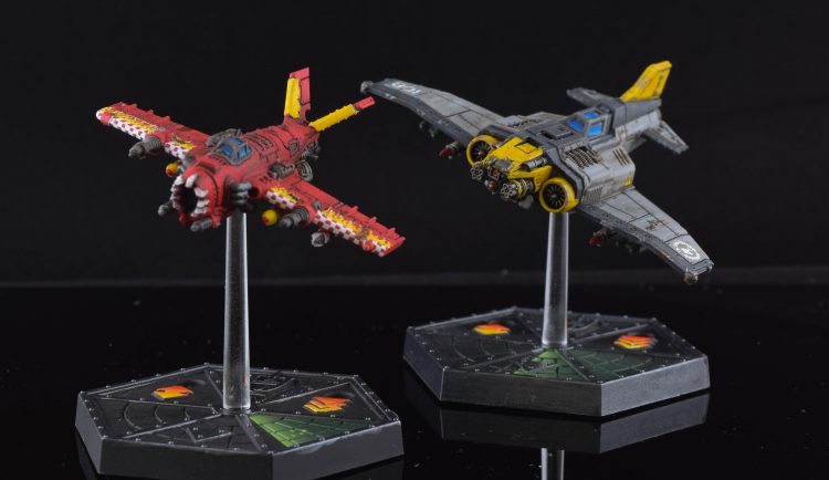 The tactics would be completely different. With a maximum speed of 5 and a minimum of 0, you have a lot of firepower but lack the speed to choose the engagement distance. You’re vulnerable to fast planes using stall turns to get behind you so you need to use a layered formation with your aircraft. This is not a bad idea as you have good medium and long range firepower available to you (but as an Imperial player it is best to be at medium range). Valkyries at the front, Vendettas at the back and Vultures at the flanks able to take advantage of the 1-8 maneuvers that they have.