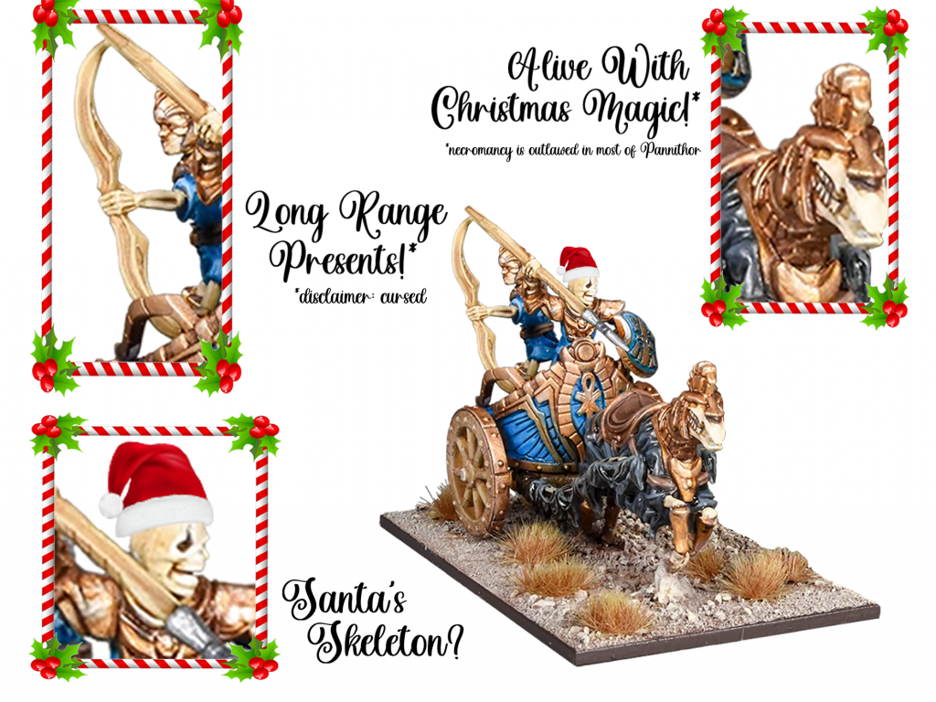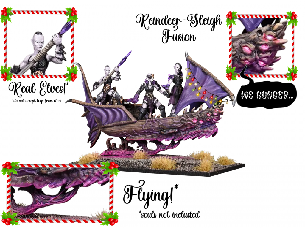 The exact mode of transport for gift distribution this holiday season is difficult to identify. Through clear reasoning and careful analyses, we think we have distinguished the most “sleigh-like” units from across the armies of Pannithor. So this Christmas eve be sure to listen for the clatter of Fight Wagons, the rumble of Revenant Chariots, the smell of gunpowder from Boomer Chariots, the flap of great Frostclaw wings, or the gibbering cackling of Void-skiffs. Who knows? Perhaps there will be one more sprue under the tree…
