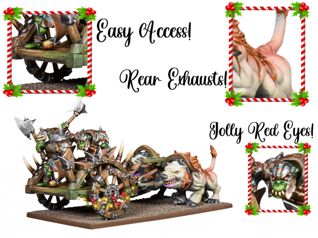 The Fight Wagon represents supreme Orc ingenuity. Orcs love to fight, and putting them right at the front of a speeding, open wagon is the best way to do it. Could such technology also be translated to the distribution of holiday joy?