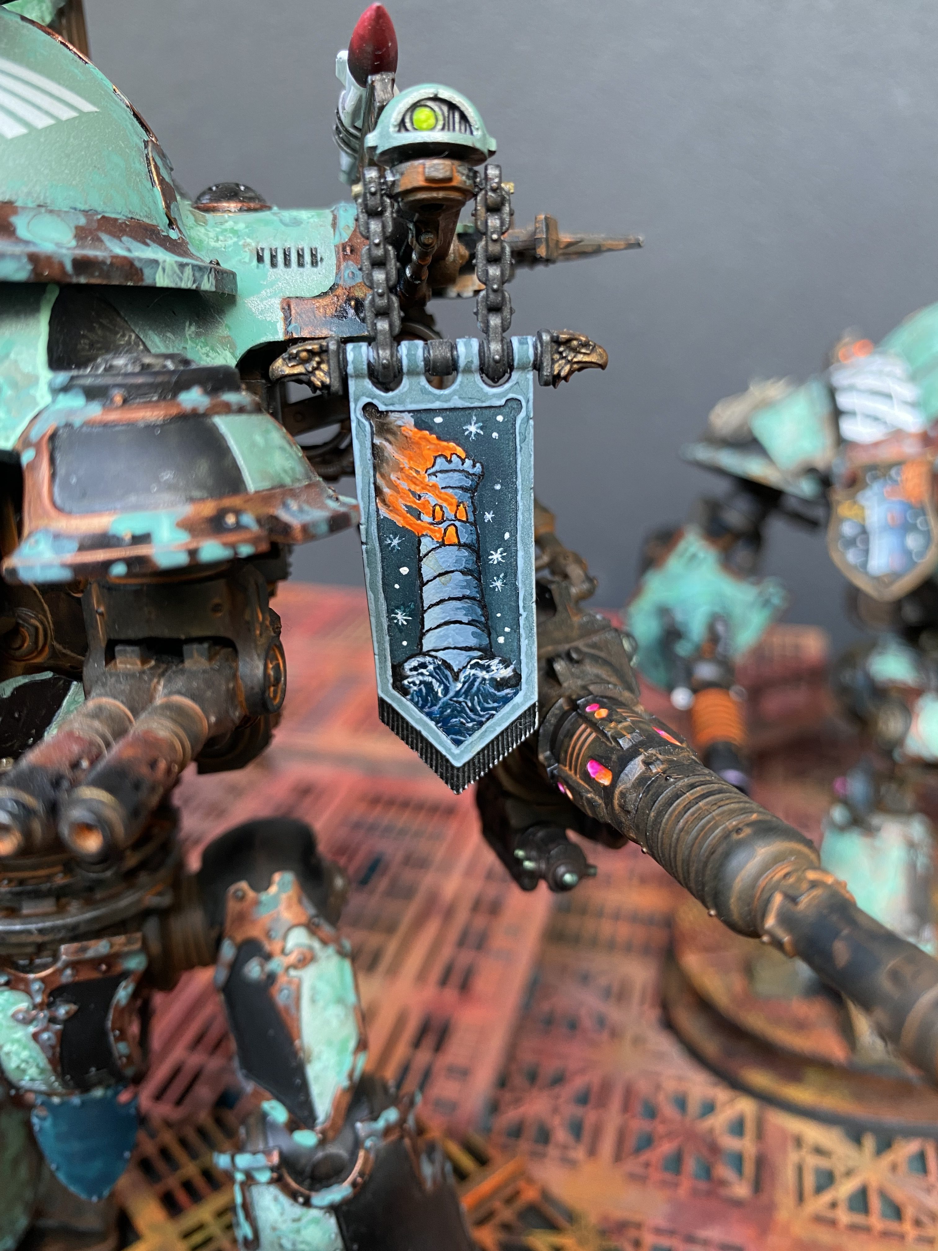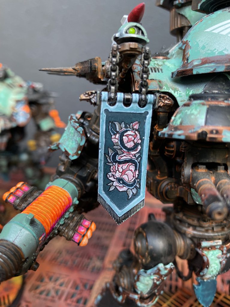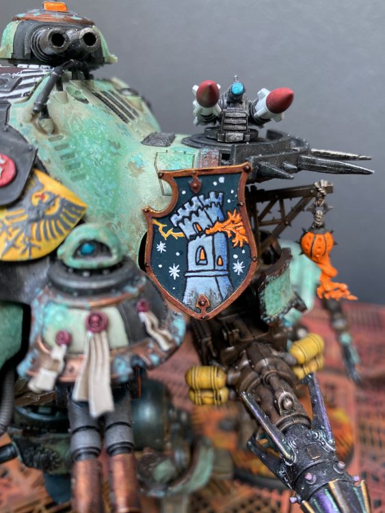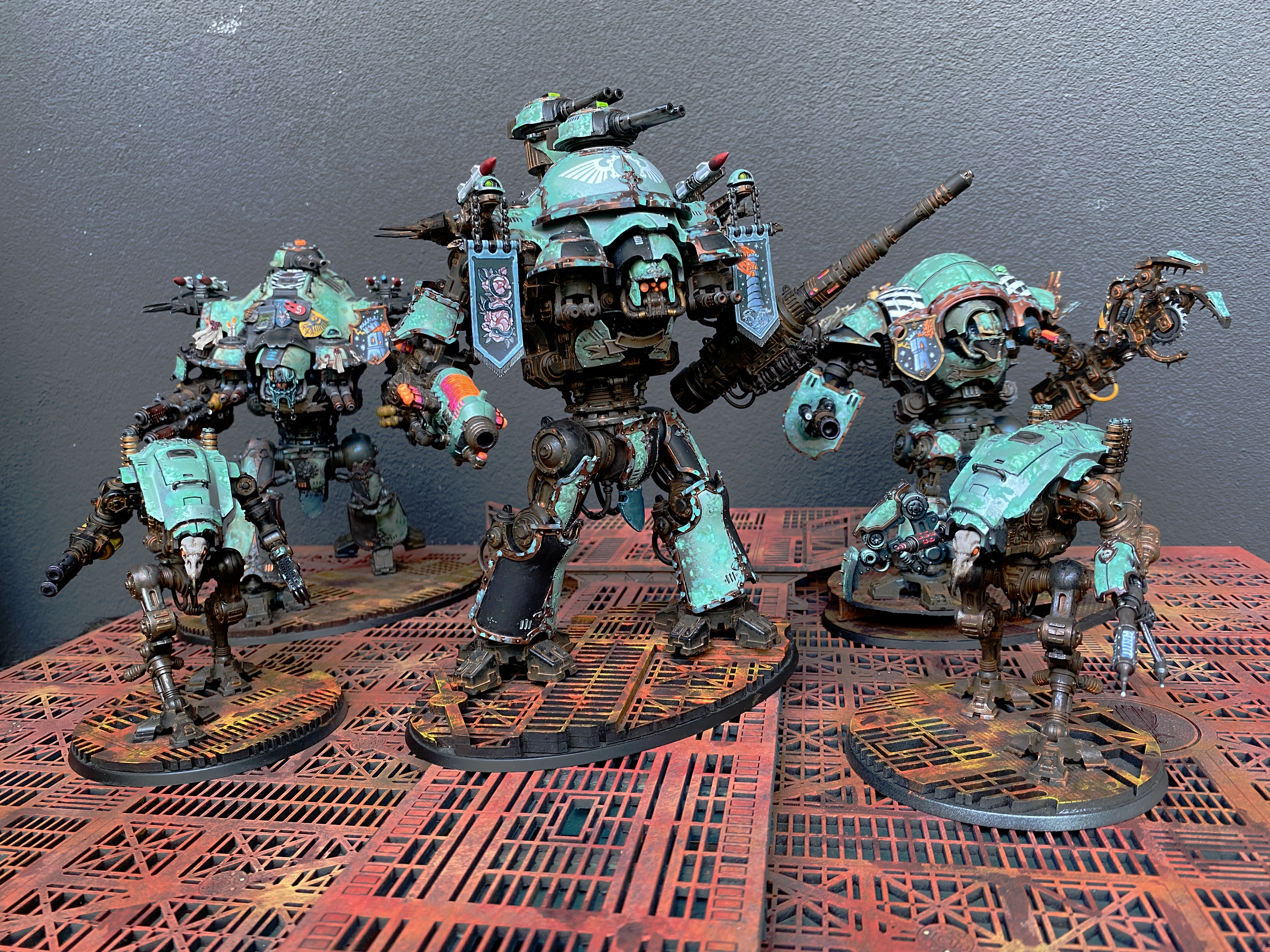 The scheme is inspired by the textures of deteriorating architecture I've always appreciated. Specifically the rusting wrought iron for the the mechanical understructure and Verdigris Copper for the carapace and armor plates. I wanted to emphasize the age of these hulking relics which predate the imperium itself in the lore while also adding organic texture and complexity to models that have lots of smooth open panels.