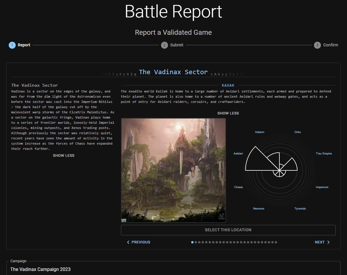 For our part, we've been hard at work on Administratum, updating the interface to handle the new Conquest mechanics we're using for the Vadinax campaign. now players reporting games can choose which planet they occurred on and see planetary control stats update in real time. We'll be continuing to improve this over the next few weeks and add even more cool features to the app.