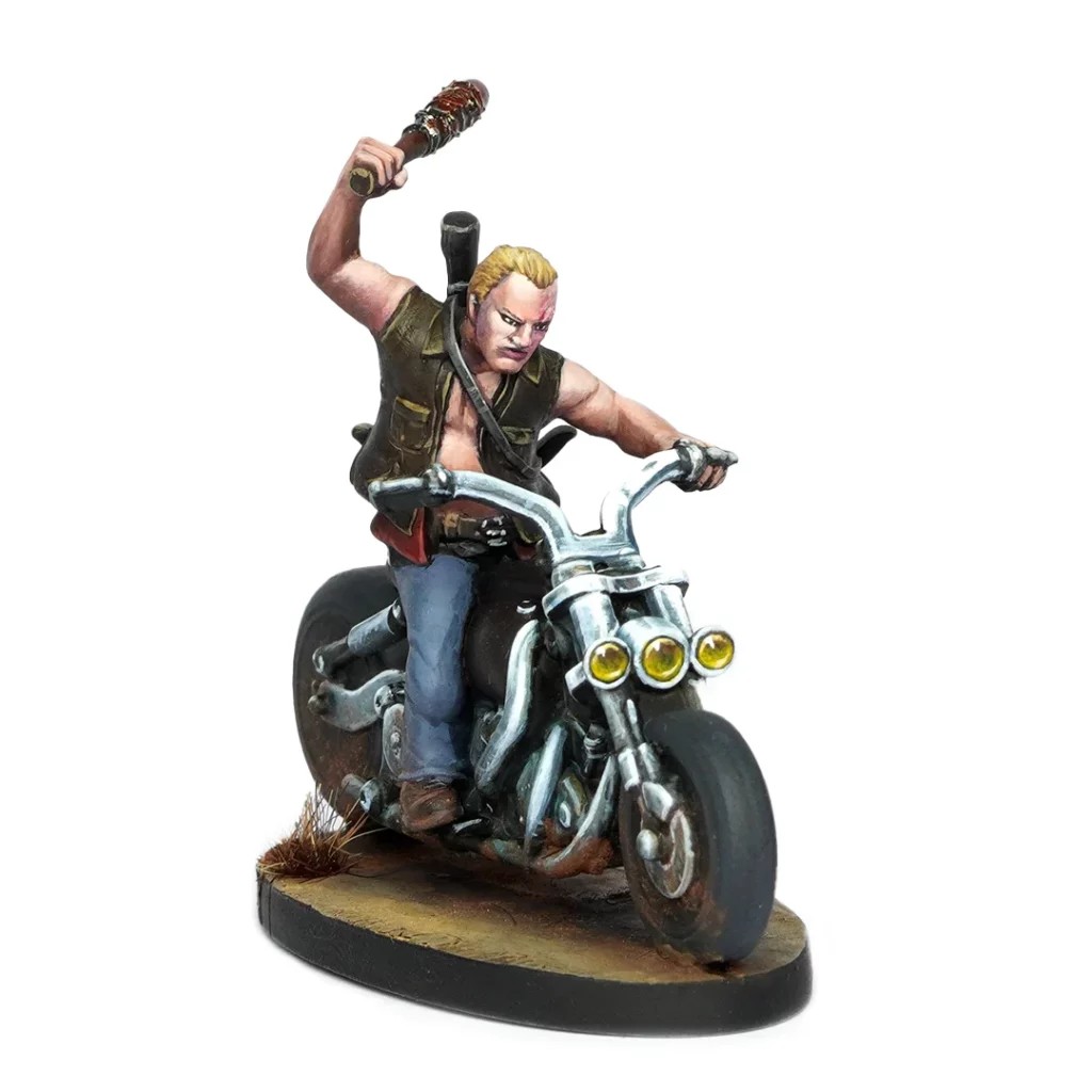 Dwight blazes across the board with speed and deadly precision, striking fast before the enemy can react. - Our second Dwight miniature, and on a bike no less. Unless I forgot about it, we have not had bikes yet in the game; only horses and ATVs. That said, I assume that, similar to those, the bike will be fast but loud, maybe able to run over Walkers and Survivors.