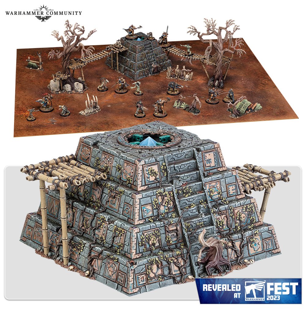 The next and final Warcry box of the season was revealed, with Stormcast Questor Soul Sworn led by a Relictor fighting a band of ghouls called the Royal Beastflayers, who include ghouls engorged by eating various large beasts and led by a vampire. The terrain includes a Seraphon Realmshaper engine, and this makes a nice imposing centrepiece to the set.