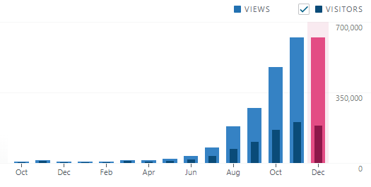 Narrative Forge to cover popular topics. May was our biggest month yet. Then June was. Then July. Then August. At the time of this writing, December has just passed November as our biggest month ever with 9 days to go and more than 620,000 page views and nearly 200 thousand visitors. That's
