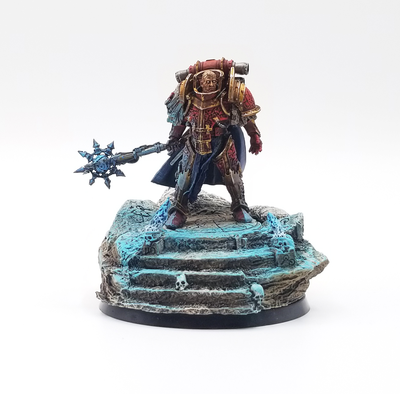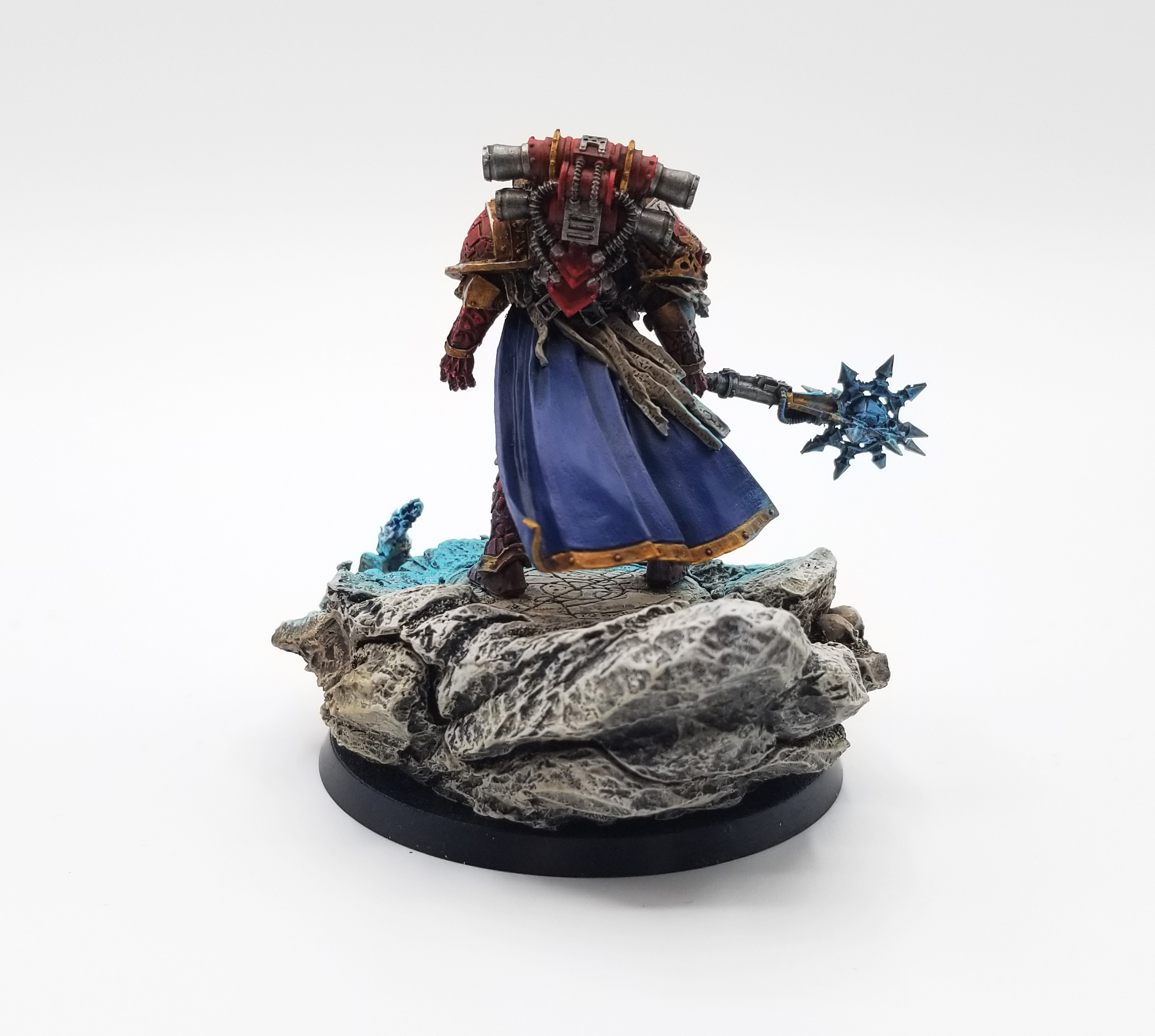 The most recent model I've painted was Lorgar. I've had this guy sitting around in my collection for a while - SD47 bought this guy for me a few years ago and while I immediately set about scrubbing him down and getting him ready to paint, when I actually went to paint him after spending all that effort washing and drying and scrubbing the model, there was still release agent on it - paint was sloughing off in a bunch of spots. I was so disheartened by the occurrence that I put the model back in his box and didn't touch him for like two years. Recently I dug him out of my bitz uh, closet, while I was looking for other models and decided to finish him (I ended up painting the spots that still had release agent in varnish before re-coating them and that worked). Otherwise, Lorgar was a right pain in the ass to assemble, with little in the way of instructions, but I'm happy with how he turned out. At some point I'll do Conrad Kurze next.