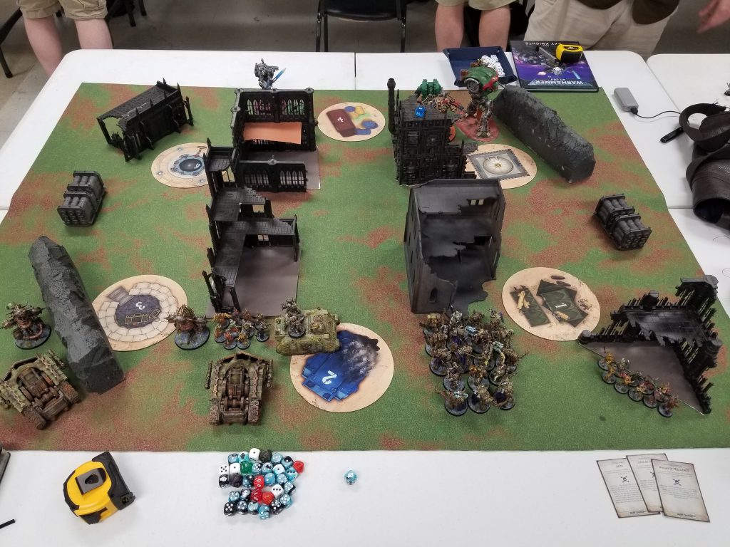 OK this is actually after the first turn but you can get a good feel for where things started. Something to note here: We were in the middle of a row of tables and playing a hammer-and-anvil deployment, so moving units on the far side of the table meant walking all the way around the table next to us to reach those units. This affected deployment for both of us, though I intentionally planned to avoid his Haulers, and would later lead to me forgetting some key unit actions. More on that later.