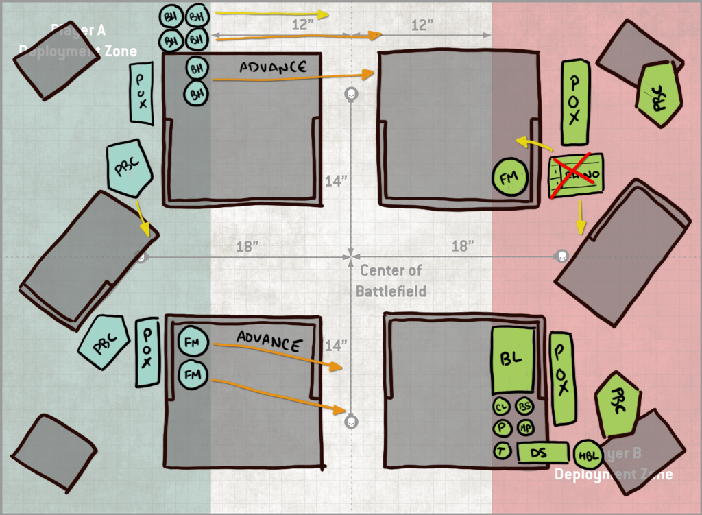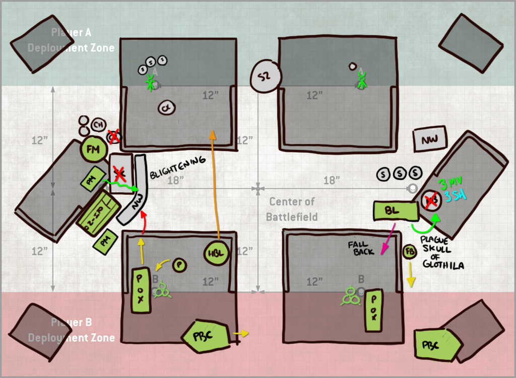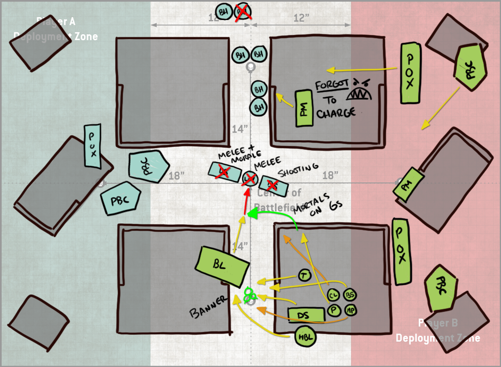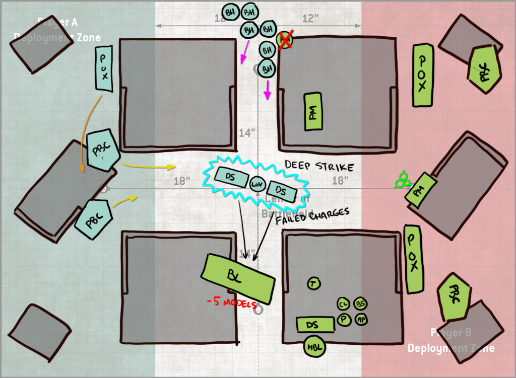 Turn 2 Jason falls back with his Blight-Haulers and uses the unengaged ones to destroy my fleshmower. That still costs him 4 models' worth of shooting however, and so it's a trade I'll take. The PBCs take some ineffectual shots at my rear PBC and poxwalkers moving forward, and the block of Deathshrouds arrives at mid-table. It's not super-clear on this drawing, but I've done a decent job blocking them out - they'd have to be split if they wanted to be in my Deployment zone, and also that would put them where my opponent literally would have been unable to easily reach and so he likely didn't consider it seriously which, same - I would not be into walking around to that side of the table over and over to do shit with them. It also strands them far away so I get it. He drops them instead in the middle of the table, shoots 5 blightlords off the table and then whiffs his charges with both units of Deathshrouds. This leaves him not even attempting a charge with his LoV. This is a bit lucky on my part, since I've left them out of range of the Blightspawn, but even with a re-roll your odds of making a 9" charge are less than 50%, so it's not exactly outlandish. Because it's the mirror, I can't make that an 11" charge though - Inexorable Advance ironically counters the Inexorable plague company Stratagem.
