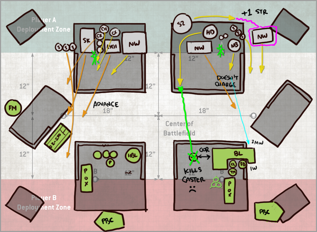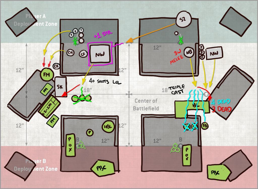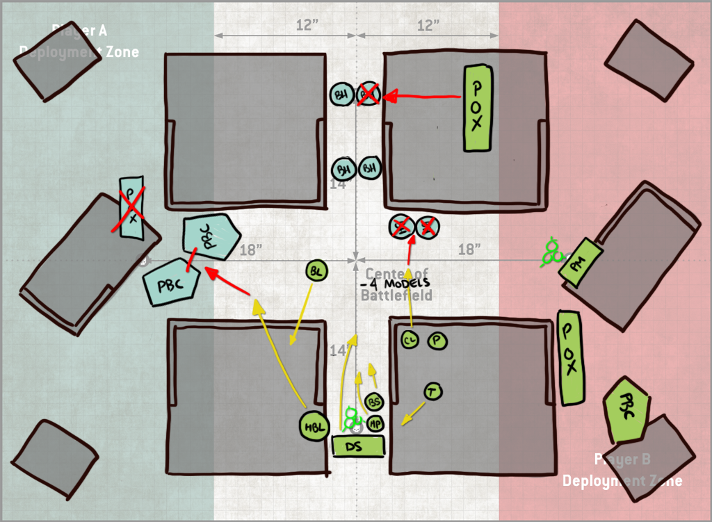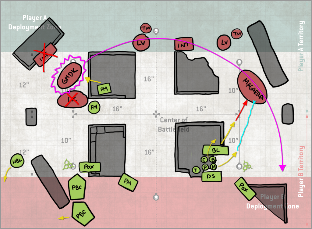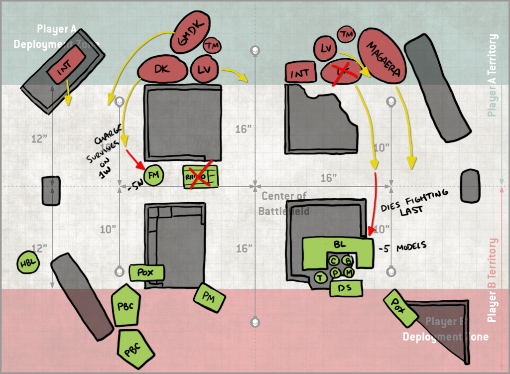Turn 2 Jason falls back with his Blight-Haulers and uses the unengaged ones to destroy my fleshmower. That still costs him 4 models' worth of shooting however, and so it's a trade I'll take. The PBCs take some ineffectual shots at my rear PBC and poxwalkers moving forward, and the block of Deathshrouds arrives at mid-table. It's not super-clear on this drawing, but I've done a decent job blocking them out - they'd have to be split if they wanted to be in my Deployment zone, and also that would put them where my opponent literally would have been unable to easily reach and so he likely didn't consider it seriously which, same - I would not be into walking around to that side of the table over and over to do shit with them. It also strands them far away so I get it. He drops them instead in the middle of the table, shoots 5 blightlords off the table and then whiffs his charges with both units of Deathshrouds. This leaves him not even attempting a charge with his LoV. This is a bit lucky on my part, since I've left them out of range of the Blightspawn, but even with a re-roll your odds of making a 9" charge are less than 50%, so it's not exactly outlandish. Because it's the mirror, I can't make that an 11" charge though - Inexorable Advance ironically counters the Inexorable plague company Stratagem.
