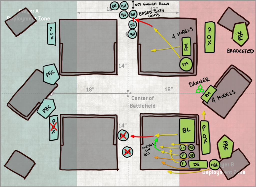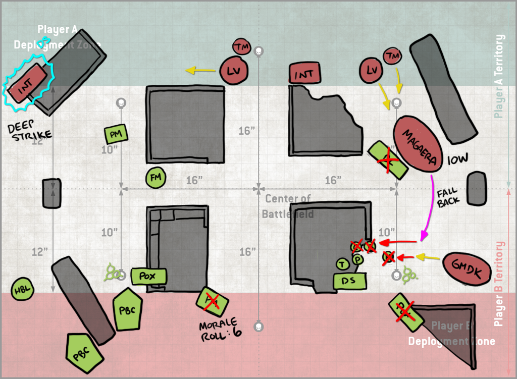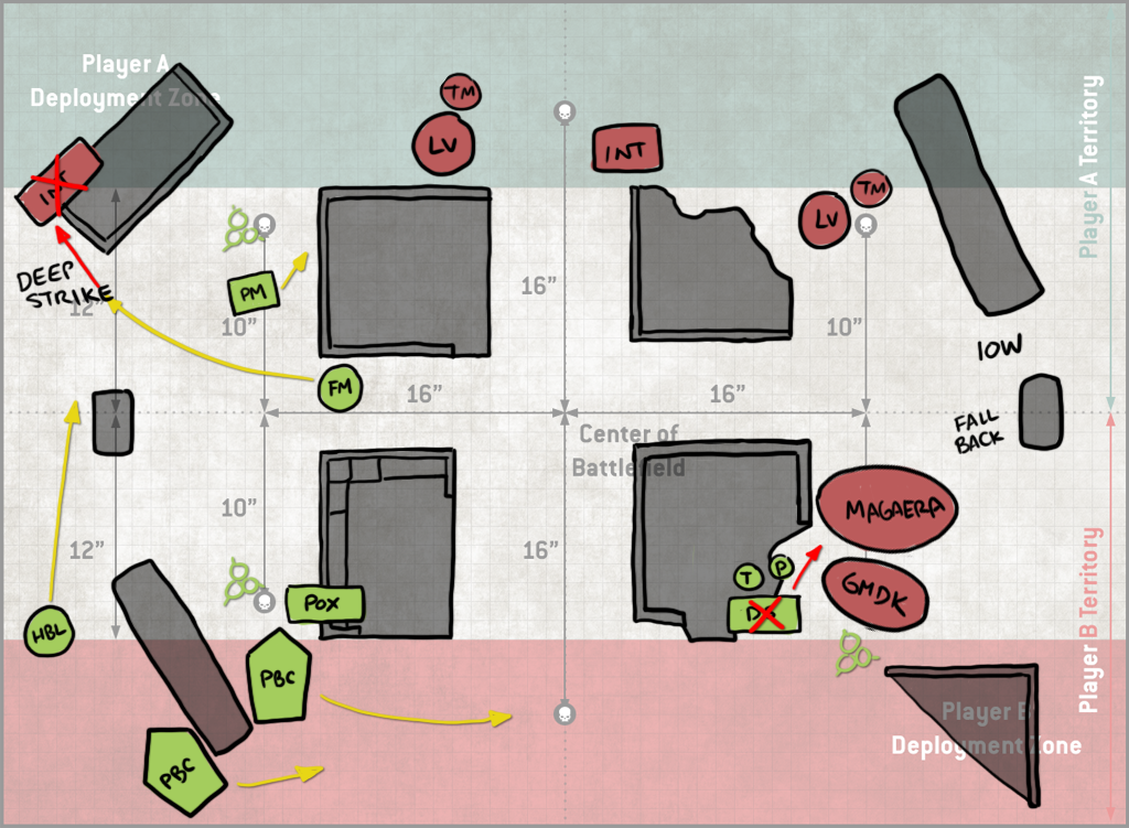 - The Deathshroud+Lord of Virulence blob. I'm not super worried about this, but the LoV can do some mortals and the group have some decent damage output. I'm not afraid of being charged by them so much as just needing to make sure they don't do too much damage to me. Jason puts both into a Teleportarium/Deep strike, so I need to keep them off my backfield, where they might cause issues and prevent me from holding the home objective - protecting that one objective on Battle Lines is supremely important.