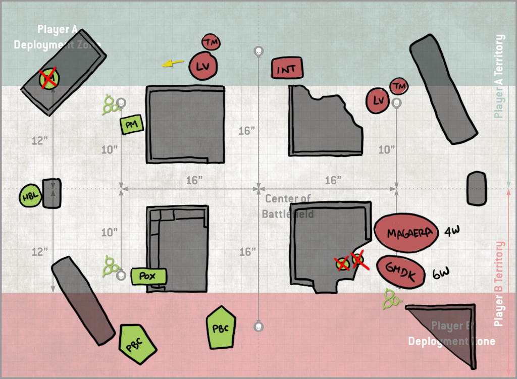 Assassination again and this is as bad a map as possible to have to hide on. To the Last is a fine pick against me - it'll be hard to kill three T8 models at range. Overrun is a bad pick.