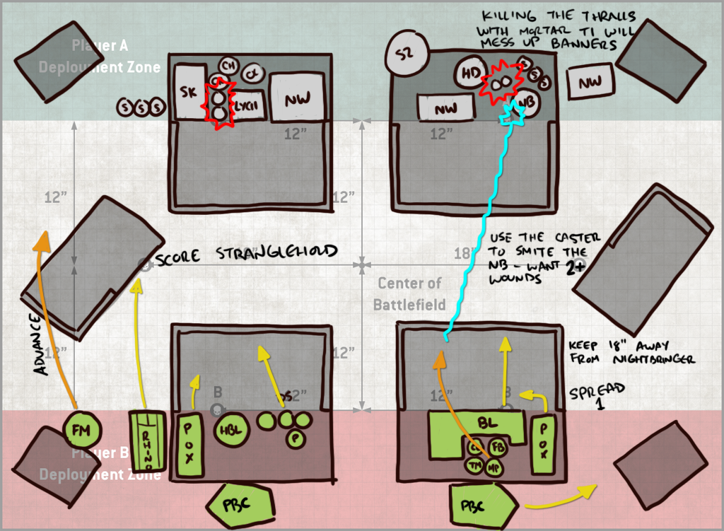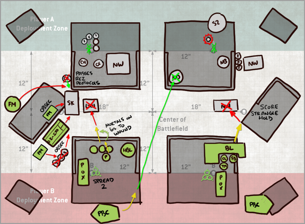 I'm pretty comfortable with Spread on this map. 3 Objectives is pretty easy to hit, and if I'm doing well I can make that four if I work my way around to either the opponent's deployment zone or if I manage to control both midfield objectives. Relentlessly expansionist is an issue for Stranglehold, but I have good enough firepower that I think I can wipe smaller units off the objectives and score repeatedly. To the Last here seems like a no-brainer, since there's only one unit that can reliably damage my PBCs at range and I'm going to use the blightlords to kill the Nightbringer anyways.