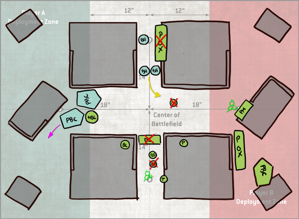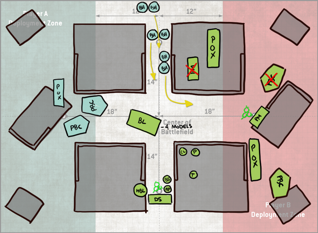 I think I can keep the PBCs around all game and Grind is out anyways since there aren't enough enemy units to make it work. Spread here is fine with six objectives to use it on. Bring it Down is probably the best of my remaining options, with up to 13 points available for it.