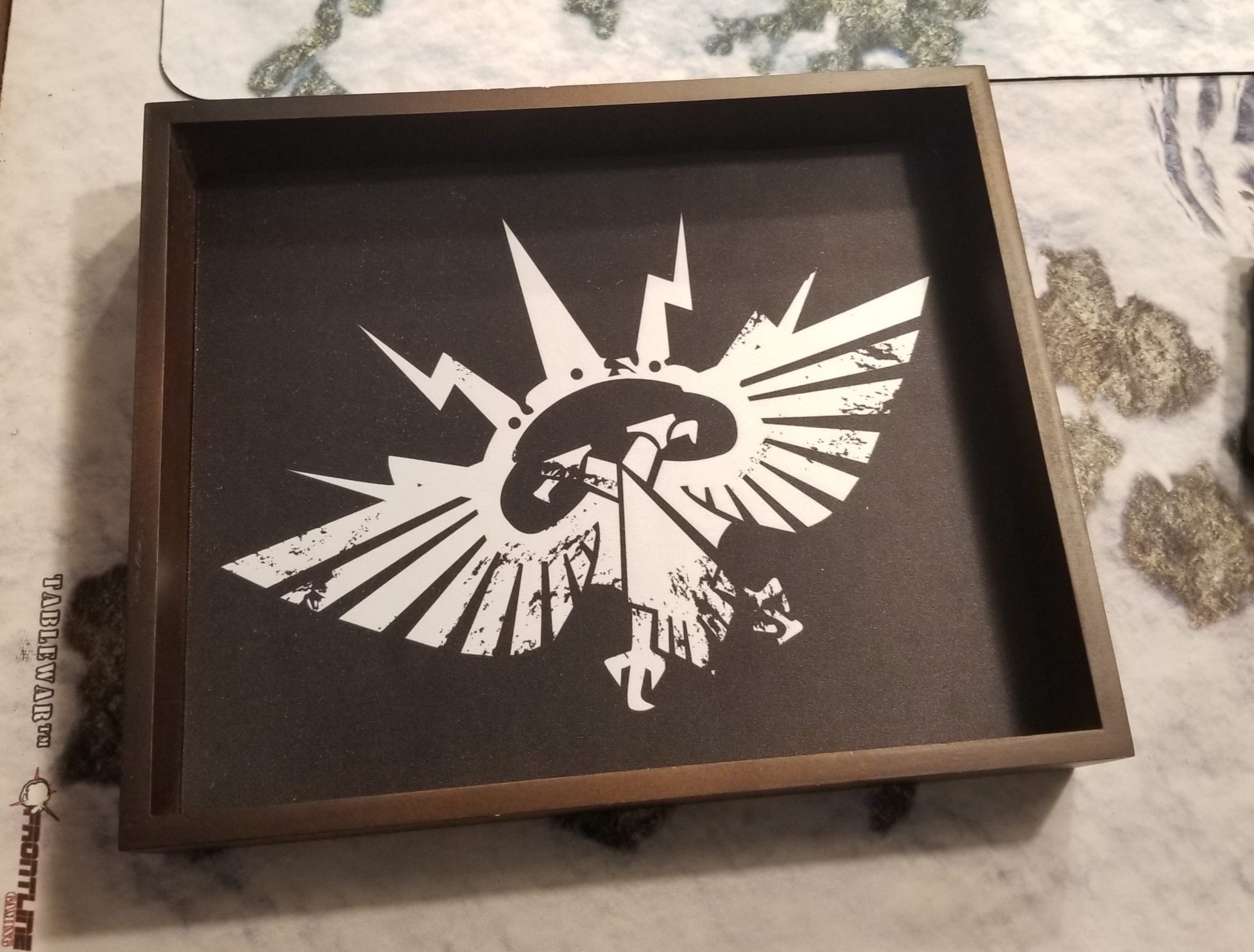 Flash forward just under two months and I'm at the event looking at these dice trays. They're nice dice trays. They have a nice finish and I like the size on them. Honestly it's kind of bullshit that GW doesn't just sell them. Anyways something my table really needs is a dice tray and I've been contemplating building one. So when Boon hands me Joey's dice tray to mail to him my resistance breaks. I pay for the upgrade ticket pack to get a dice tray of my own (plus a t-shirt, both event models, and a minis case).