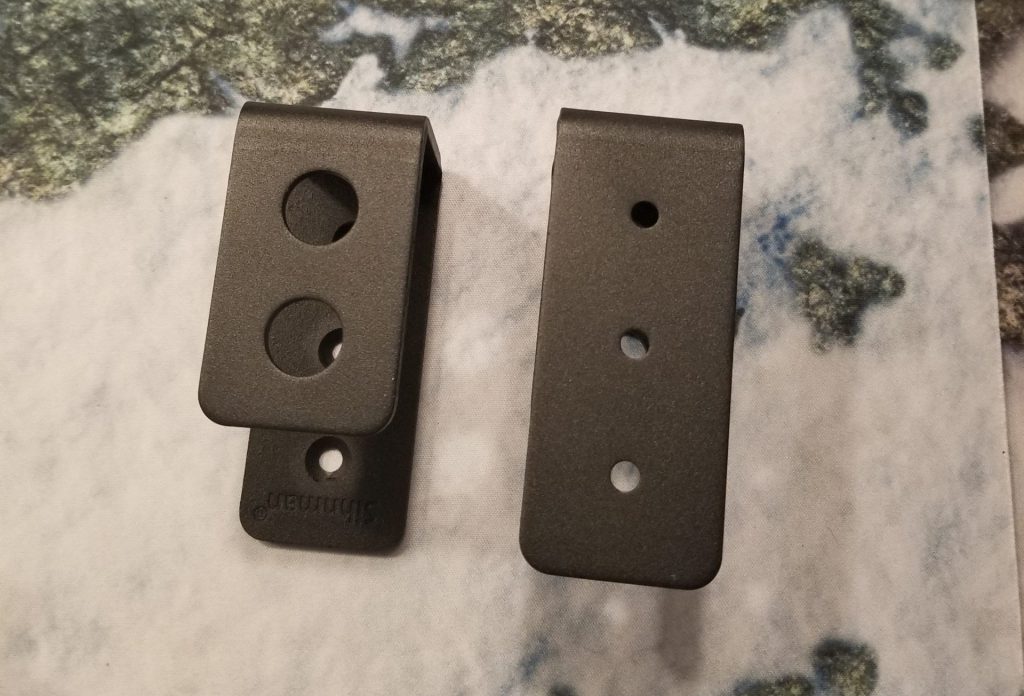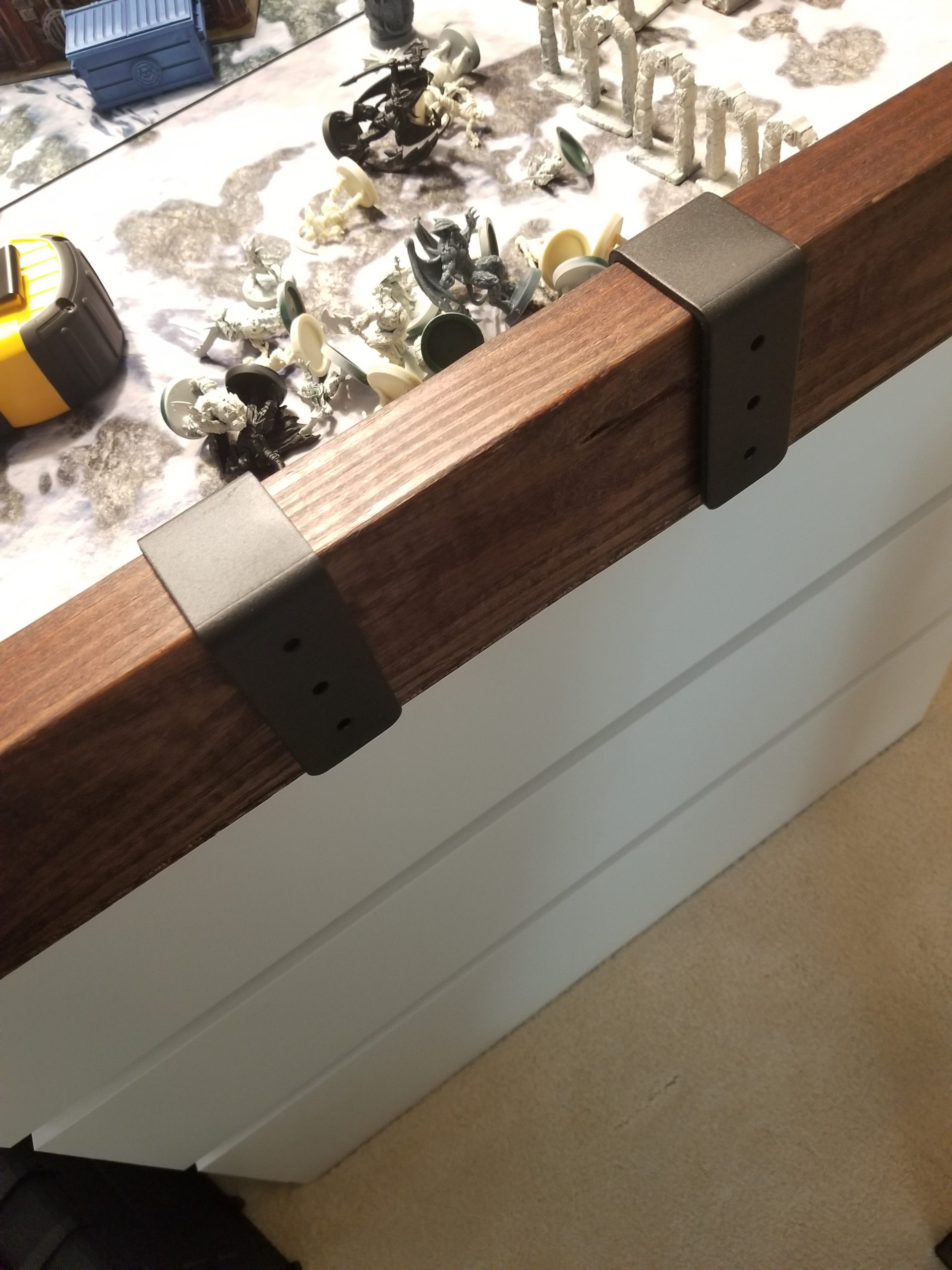 This is a pretty simple process. I picked up two iron barricade brackets - they're designed to hold a 2x4 across a door for when you want to barricade a door - because they were basically the only thing I could find that had the U-shape I needed to fit over the 2x4s that made up my table. Then I took a power drill, put two holes in the side of my dice tray, cleaned out the sawdust, and then ran two bolts through it. I went with bolts here on the chance I want to remove it later, and because wood screws would have required me to file off the pointed ends and that would have been more work than it was worth.