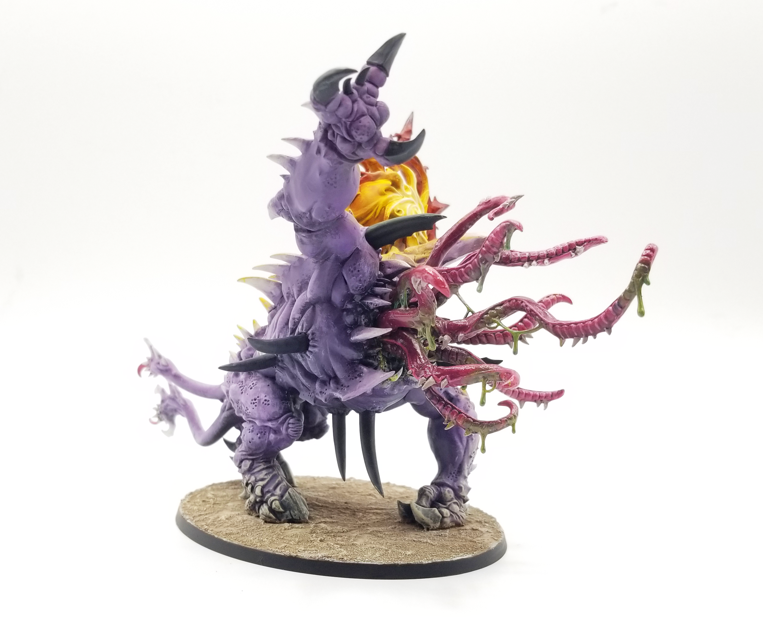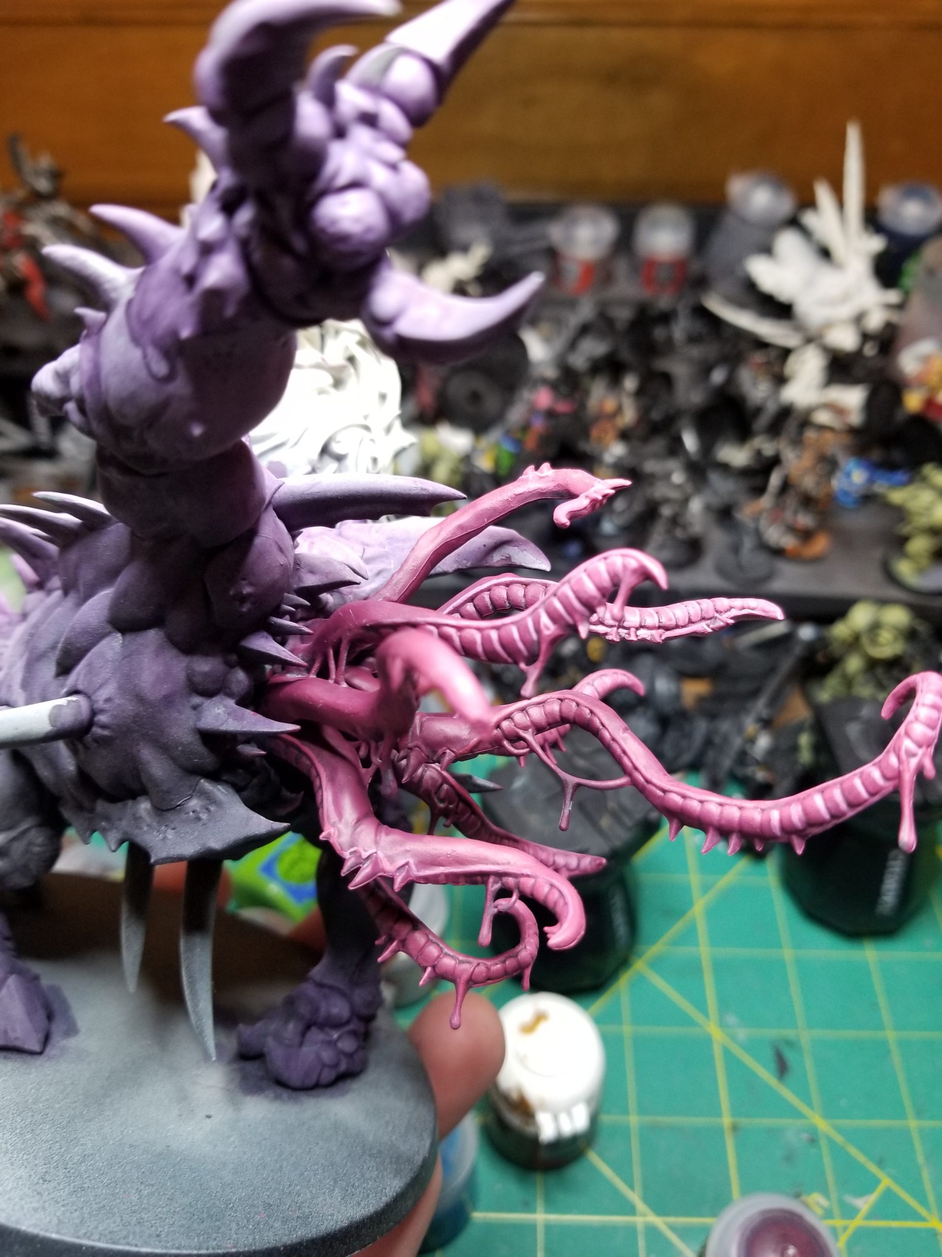 In addition to my first squad of Rubrics, I also painted up the Mutalith Vortex Beast. I've had this model for a long time. I used the slaughterbeast half to convert up a Chaos Knight and since then he'd been sitting in my bitz closet. So a couple months ago I pulled him out, dusted off the sprues, and assembled him. I went with a relatively simple paint scheme, doing mostly pinks and purples, with a bit of OSL for the flame. The tentacle maw is my favorite part, and was the most fun to paint.
