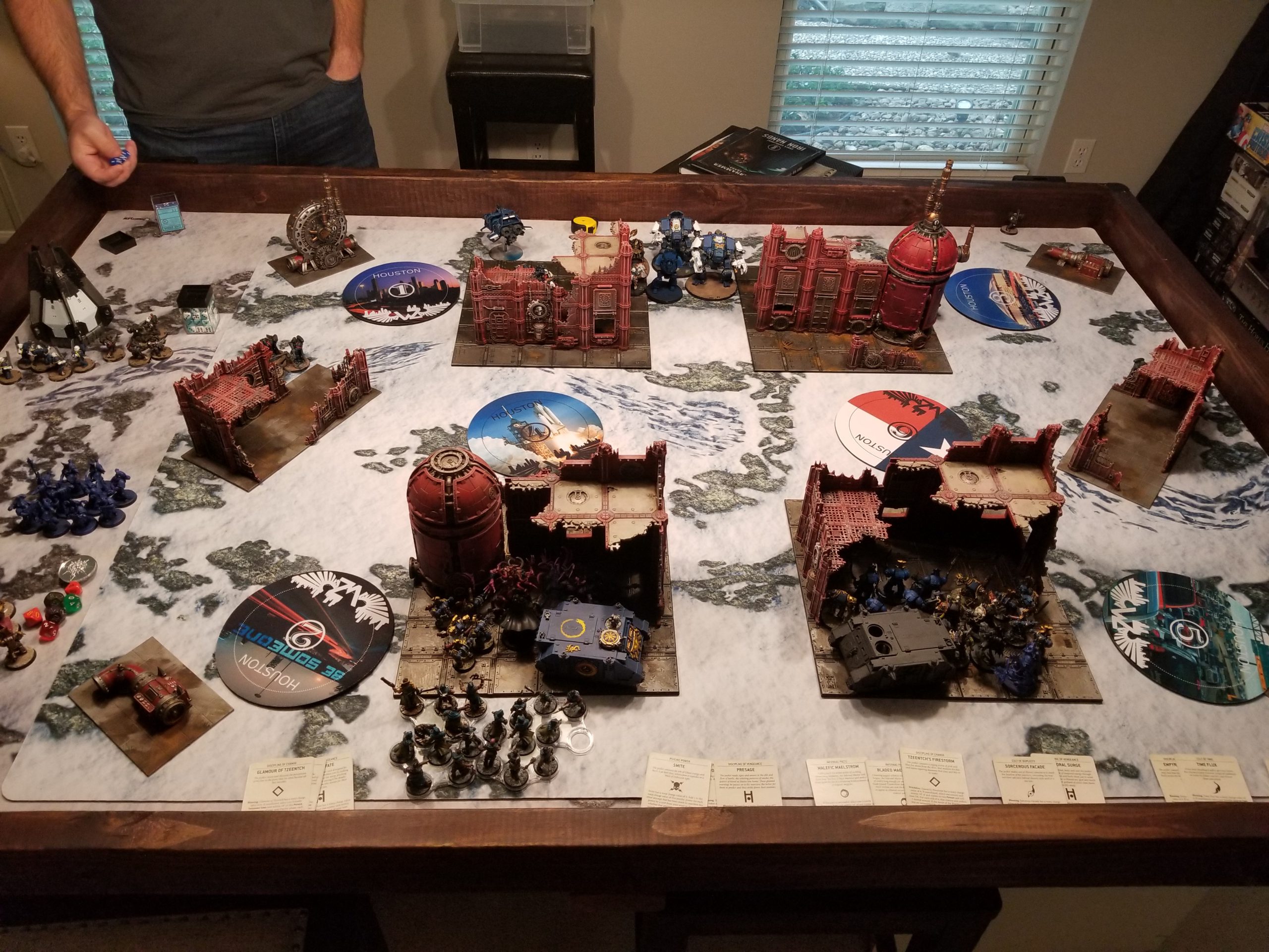The army is also as difficult to manage mentally as I'd expected, and tracking who had what powers to cast when was incredibly taxing. I need to start thinking about cheat sheets for future games and doing a better job tracking how I'm managing my psychic phase. The psychic phase took forever and I found out that once I cast powers with a character, I forgot who had cast them. I'm going to move to colored sleeves for different casters and potentially just label the backs or color-code them to bases in order to make it easy to remember who has what, though I suspect I'll also need to create multiples of particular cards to handle where I have redundancy. I also just need to get smarter about planning those phases out and how and where I'll need buffs. My plan is to hit up some of the discords I'm in this week and look for advice, and then check out the Hellstorm Wargaming stream of the Goonhammer Open UK matchup of Thousand Sons vs. Sisters for some study on how the army plays. Hopefully one or both of those will prove helpful.