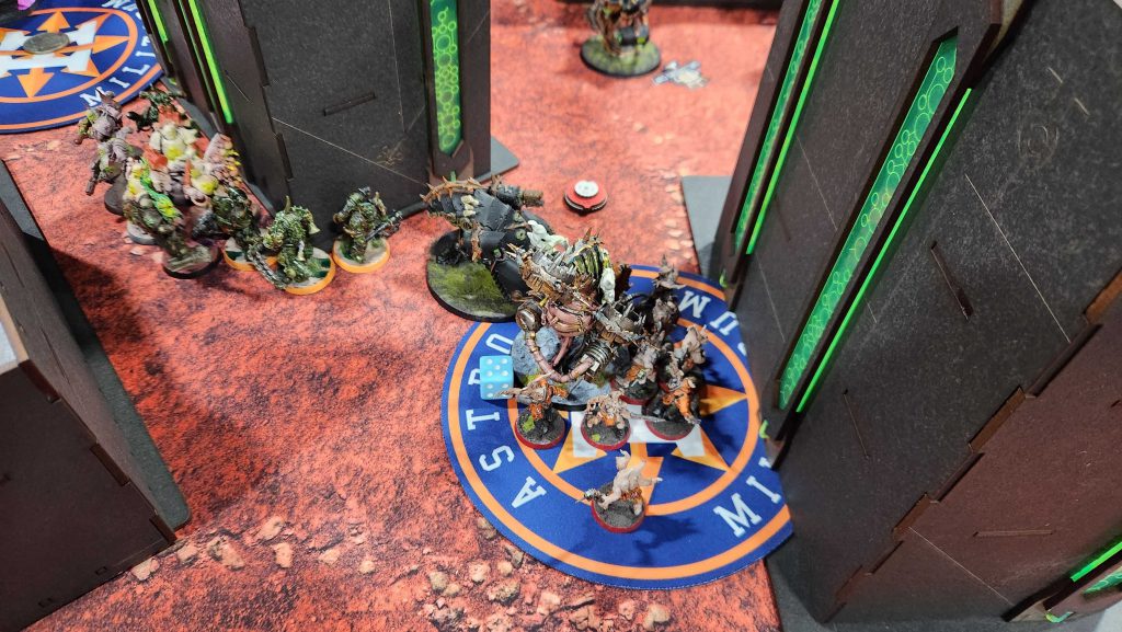 I win the roll-off, and that means I have to be a bit more aggressive. I push up with the Poxwalkers to block his movement and kill one of the battlewagons, then I use the Mortaros to wipe his grots off his home point, forcing him to hold it with something else. I'm not super aggressive about holding points right now but my plan is to just hold two right now and keep Chris to 1.