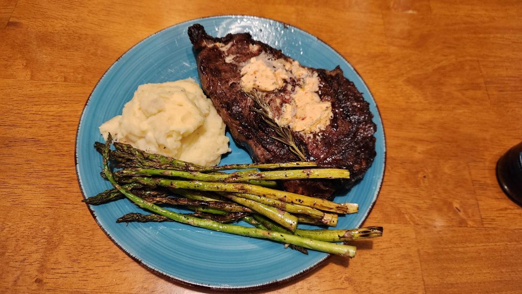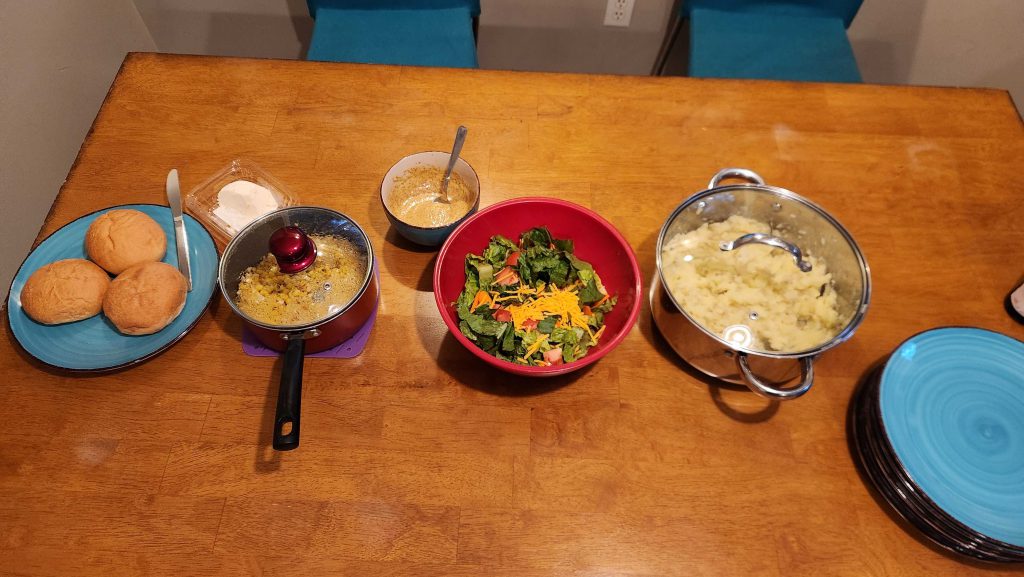 The primary plan was to cook sausage (beef smoked and beef kielbasa) and BBQ chicken breasts on the grill, with the secondary plan of cooking everything else we'd bought so we could minimize food waste. I cooked up the other half of our potatoes to make garlic mashed potatoes again, and the original plan called for corn on the cob but the corn looked a bit rough on the ends so we cut it off the cob and sauteed it in butter instead. We had some yellow rice I'd forgotten to make on taco night in the mix, and I cut up the romaine hearts and tomatoes I'd bought for sandwiches and used them to make a salad, adding some sliced baby carrots and cheddar cheese. We didn't have any dressing, but I had a bottle of Dijon mustard around so I combined that with the leftover maple syrup we had and a bit of olive oil to make a honey mustard that was pretty damn tasty.