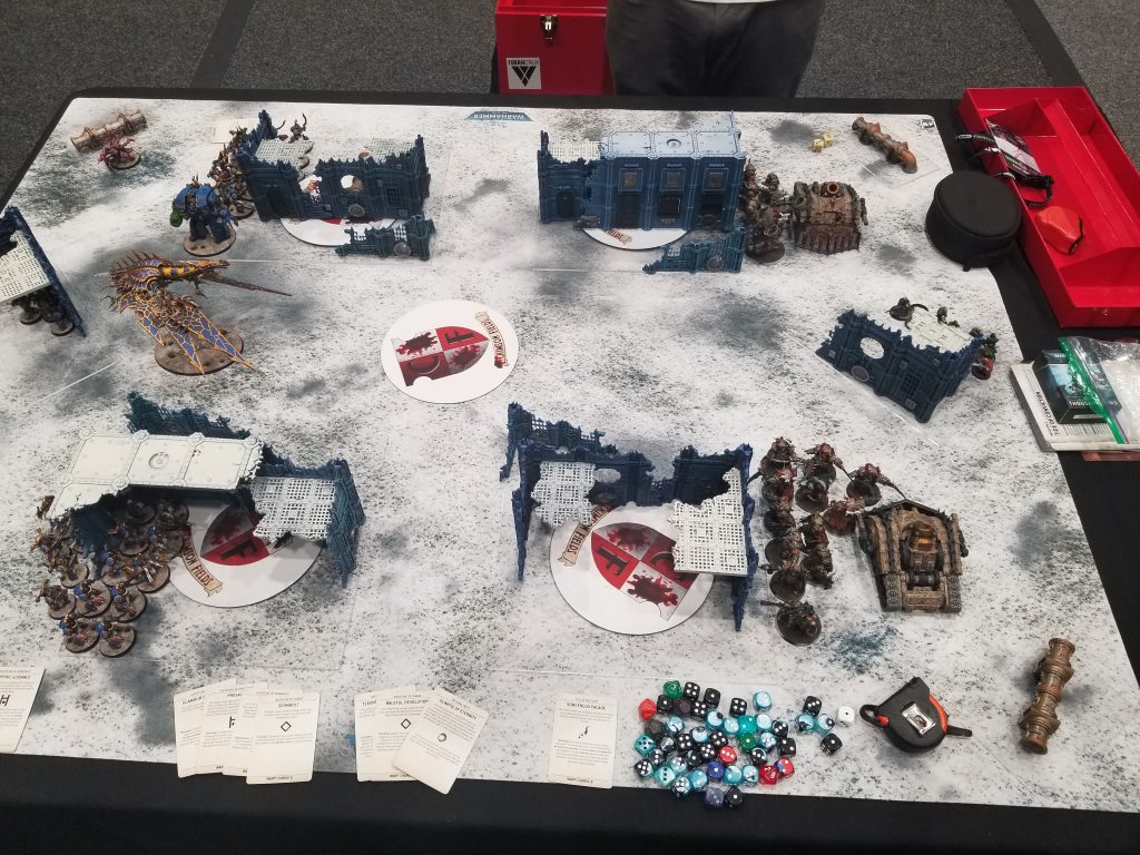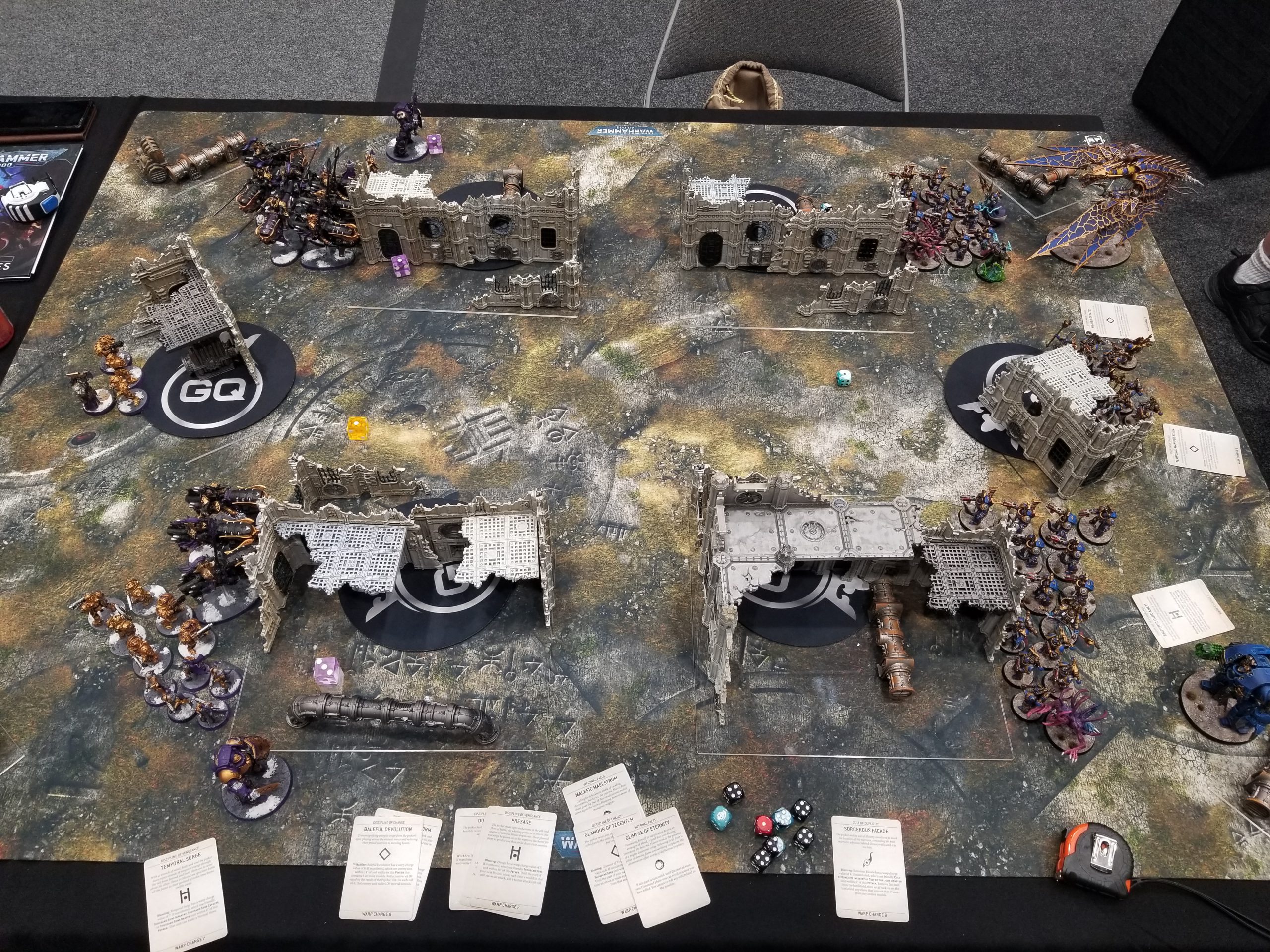 That's OK for me. It's mostly solid because it lets me whittle down Mike's forces and position for two turns before the Bloodletters and Lord of Skills arrive, which I do. A turn 1 Rubric Teleport gets them dropping a few Cultists, and from there I proceed to max Wrath of Magnus. Likewise my Scarabs hold the middle all game for Stranglehold, and I score the easy 10 on Banners.