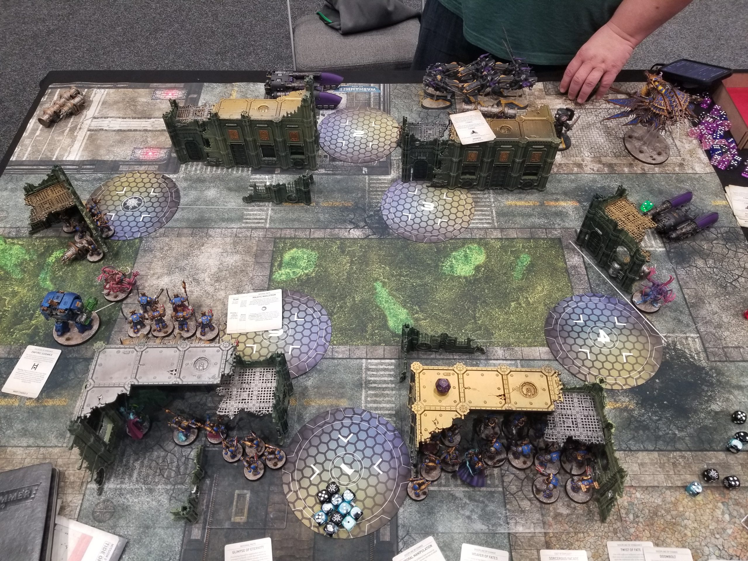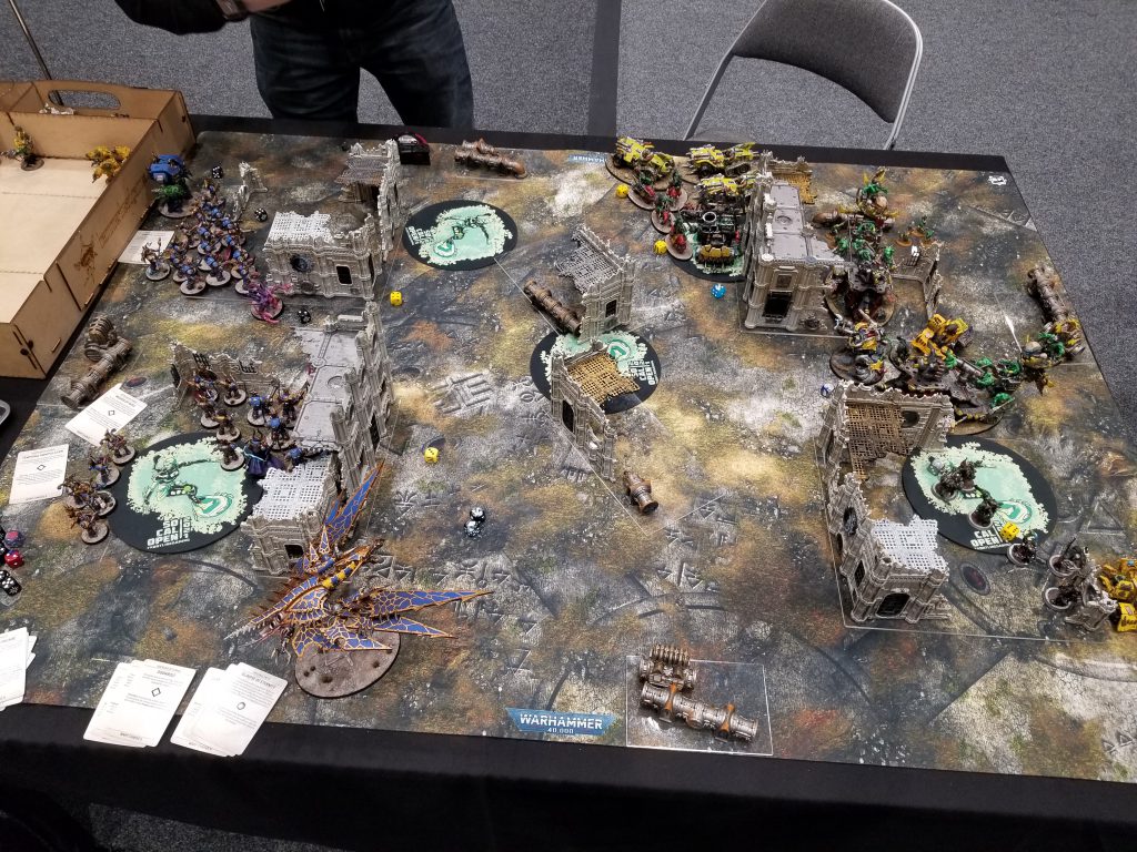 Unfortunately I don't get first turn. Ben gets off a long charge into my Terminators on turn 1 at the northern point after I fail to kill a single model in Overwatch, then I completely fuck my saves and end up losing all 10 terminators to the two charges (the meganobz and the warboss). That pretty much fucks me for the game, while the Kill Rigs wipe the Heldrake. It's not completely unsalvageable at this point, but my dice are just not cooperating with my comeback attempt and Ben's never really in danger of losing it. He plays a solid game and has pressure on me the entire time, never giving me an opportunity to score Stranglehold until turn 5, jamming me in my Deployment zone for most of the game and successfully screening out my smites.