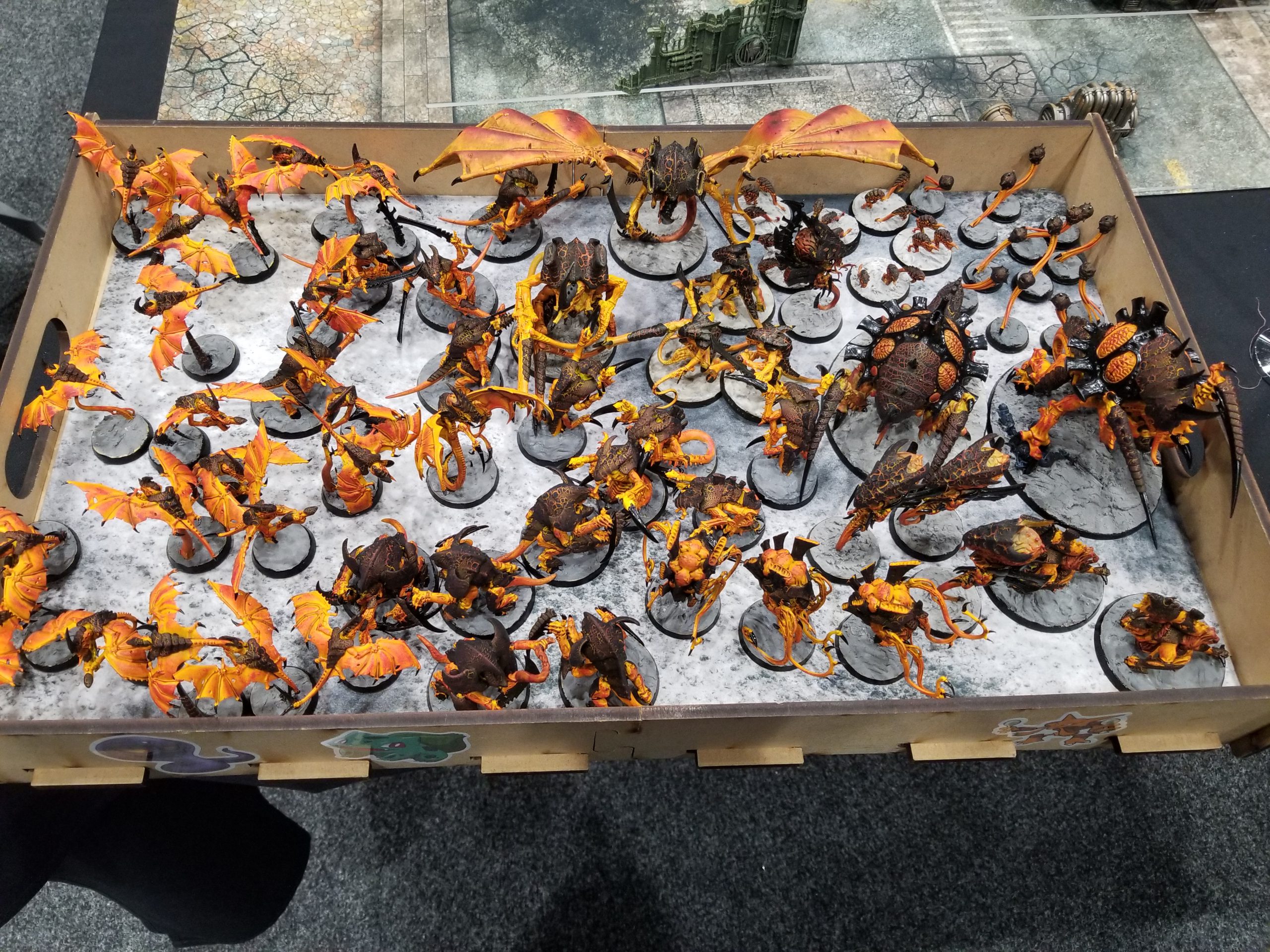 Winged Hive Tyrant [11 PL, 205pts]: Adrenal Glands [15pts], Lash Whip and Monstrous Bonesword, Power: Hive Nexus, Power: Onslaught, Power: Psychic Scream, Relic: The Reaper of Obilterax