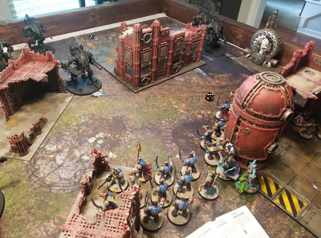 Andrew uses Auspex Scan with his Eradicators to take out 3 Terminators, but that gives me the opportunity to force bringing one back with Warped Regeneration in my Psychic phase, getting me closer for a charge. My Terminators end up killing the Dreadnought and the Eradicators in the psychic/shooting phases anyways, and so fail their charge into the Infiltrators. I also manage to focus down another Redemptor with the War Dogs and the other terminators, while putting the third on its bottom bracket. And that's pretty much the game. My Terminators will sweep through Andrew's flank, take him off the home objective, and I'll manage to max out everything but To the Last, where I lose points for losing a War Dog.