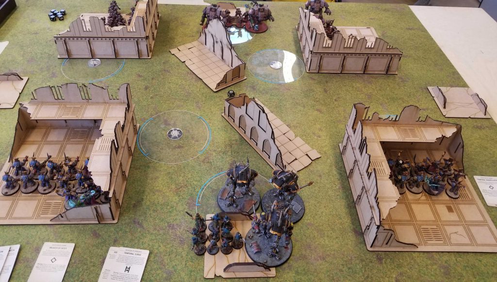 I immediately press to the middle, hoping to use a double-move, but Luke denies that cast with a roll of 11 (c'mon), forcing me to spend a CP to double cast and use Sorcerous Facade to move to the middle. I'm not able to take down the Abominant turn 1, but I do put it on its lowest bracket and force it to hold back on turn 1 as Luke tries to make something happen with his war dogs. On turn 2 I basically end the game by taking out the Abominant plus another 3 war dogs, leaving him with only 3 left.