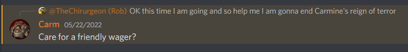 The Houston locals I hang out with have a Discord we use for chatting and talking shit between games. At some point in late May, I made it clear that I wanted to win the next one, and bring down Carmine, a local Adeptus Custodes players who had been running over the locals at these RTTs.