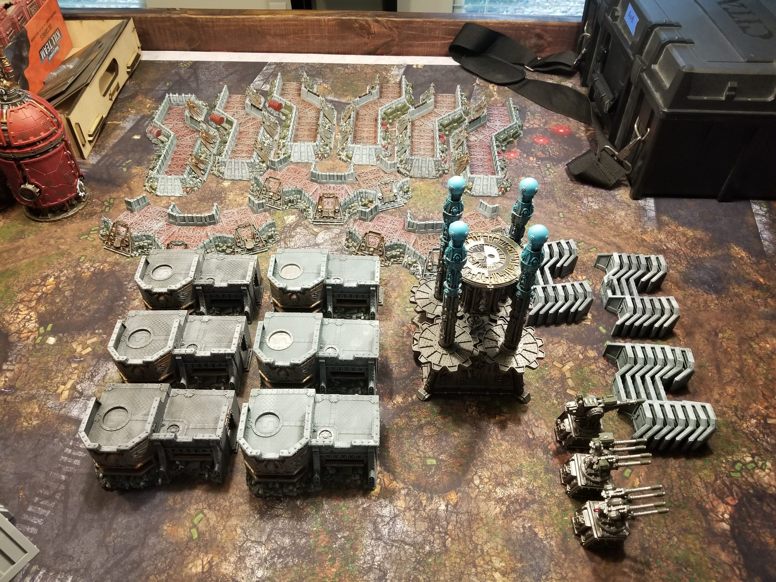 When those arrive, they'll be joining another set of trench lines, 2 more bunkers, 2 bastions, a fortress of redemption, and a plasma obliterator. The idea here is to have a large pool of free fortifications for defenders to use in missions that require it, such as the "Planetfall" mission that kicks off the campaign. Defenders get free fortifications and attackers get preliminary bombardments to soften those defenses. Also, some of the fortifications can shoot at other tables.
